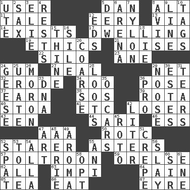 ACROSS 1. One who uses or employs something 5. Daniel's nick name 8. The first octave above the treble staff 11. Story 12. Suggestive of the supernatural 13. By way of 14. Is 17. Residence 19. Principles of right and wrong 21. Annoying sounds 22. Grain storage tower 23. One (Scot) 24. Chewing product 27. Anneal 29. Fish or hair follower 32. Wear away 34. Friend of Pooh 36. Airs 37. Merit 38. Mayday 39. Round or rotation of duties 40. Portico 41. And so on (abbr.) 42. Failure 43. Car or cant ending 44. Indian skirt 46. Curvy letter 47. American Automobile Association (abbr.) 50. College mil. group 52. A viewer who gazes fixedly 55. Michaelmas daisies 57. Coward 59. Threatening words 62. 100% 63. Body of Kaffir warriors 64. Ache 65. Beverage made from leaves 66. Consume 67. Jane of fiction DOWN 1. Shoshoni 2. Saxophone 3. Writer Wiesel 4. Musical pauses 5. Morning condensation 6. Sports stadium 7. High-strength synthetic material 8. Advice 9. Actor's bit 10. Labels 12. Begley and Asner 15. One or ones belonging to thee 16. Filth; sediment 18. Whopper 20. Unrefined 24. Honkers 25. A salt of uric acid 26. Person of subnormal intelligence 28. Plunders 29. Trap for birds or small mammals 30. _____ Park, CO 31. Rends 33. Heredity factor (abbr.) 35. Motion picture awards 36. Adept person 42. 61 cubic inches 45. Printing process, for short 47. Nonscientific branch of learning 48. Nest on high 49. Scent 51. Streamer paper 52. Petty quarrel 53. Lacquered or enameled metalware 54. Silent film actress Nazimova 55. Black tropical American cuckoo 56. Kill 58. Choose 60. Title for a knight 61. Compass dir.