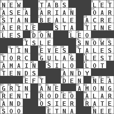 ACROSS 1. ___ Haven, CT 4. Bar bills 8. Allow 11. Toward the sea 13. Believer in; advocate of (suffix) 15. Boat paddle 16. Comedian Laurel of Laurel & Hardy 17. Calif. Air Force Base 18. 1/640 square mile 19. Nest on high 21. R.R. building 22. Prong on a fork 23. French article 24. Spanish title 27. Lion 29. Small island 30. Overwhelms 34. Metal container 36. Nights before holidays 39. Falsehoods 40. Torque (variant) 41. POW camp 43. For fear that 44. With great haste 46. Grain storage tower 47. Car dealer's back yard 48. Looks after 49. "60 Minutes" Commentator Rooney 51. Lizard (obsolete) 53. Lair 54. Teachers' org. 57. Broad smile 60. One (Scot) 63. Amid 65. Monthly bill 66. Cowboy competition 69. Having or resembling wings 70. Also 71. Flexible twig of a willow tree 72. Pace 73. "Barney Miller" actor Jack 74. Inactive volcano in Sicily 75. Born DOWN 1. Rhinal 2. First name in cosmetics 3. Erodes 4. Keyboard key 5. "We ___ not amused" (Victoria) 6. Prejudice 7. Table seasoning 8. Venues 9. Merit 10. Relationship diagram 12. Cuckoo 14. Actress Patricia 18. Lacking a tonal center or key 20. Begley and Asner 25. Cassini of fashion 26. Congenital growth or mark on the skin 28. Eastern Standard Time (abbr.) 29. Event 31. Butter sub 32. Compass direction 33. Fast jet (abbr.) 34. Heavy book 35. SW Asia republic 37. Connecticut Ivy Leaguer 38. Vegetable dish 40. Make lace 42. Went 45. Overdraft (abbr.) 50. Heredity factor (abbr.) 52. Pacific island yam 54. Pitcher Ryan 55. Related on the mother's side 56. Match 57. Pate de foie ____ 58. Western Nevada city 59. _ china 61. Sense of smell 62. Prepare for publication 64. Make imperfect 67. Car or cant ending 68. Mouth or opening