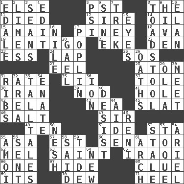 ACROSS 1. Otherwise 5. Pacific Standard Time (abbr.) 8. Definite Article 11. Passed on 12. Male parent of an animal 14. Lubricate 15. At full speed 17. Abounding in pines 18. Actress Gardner 19. Small, flat, pigmented spot on the skin 21. Supplement with great effort 22. Lair 23. Double-curved letter 24. Infant locale 25. Mayday 27. Snakelike fish 28. Tiny particle 31. Assign a rank or rating to 35. Cards in a Roman deck? 37. Lacquered or enameled metalware 38. SW Asia republic 39. Allow head to fall sleepily 41. Opening into or through something 42. Actor Lugosi 43. Teachers' org. 45. Narrow board 46. Table seasoning 47. Title for a knight 49. Nine, plus one 51. Binary compound 52. R.R. building 55. White ___ sheet 57. Eastern Standard Time (abbr.) 60. Elected representative 62. Cartoonist voice _ Blanc 63. Virtuous person 65. Resident of Iraq 66. Single 67. Flintstone garb 68. A slight indication 69. It is 70. Morning condensation 71. The bottom of a shoe or boot DOWN 1. Peak District village in England 2. Citrus fruits 3. Seines 4. Prepare for publication 5. 23rd letter of the Greek alphabet 6. Trig term 7. Long journey 8. Inedible or poisonous agaric 9. Hub of activity 10. Liveliness 13. Sight organs 16. Mediterranean tributary 17. Cotton for raincoats, e.g. 20. Highlander 26. Expletives 29. Rounded earthenware pot or jar 30. Rendezvous 31. Teases 32. Length times width 33. Baron Munchausen's specialties 34. Related on the mother's side 36. Electrically charged atom 40. Stop 44. Assistant 48. Painter Guido (1575-1642) 50. Delicate 52. Lacking originality or spontaneity 53. Woman's close-fitting hat 54. Satellite of Uranus 55. Mine, in Marseilles 56. Transmitted 58. Alleged 59. Event that recurs at intervals 61. Bowlike part 64. ___ Haven, CT