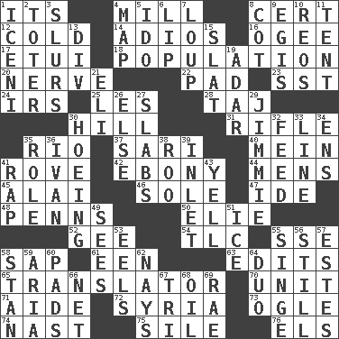 ACROSS 1. It is 4. Place where flour is made 8. Certainty 12. Chilled 14. Goodbye (Sp.) 16. Double curve, resembling the letter S 17. Needle holder 18. Census information 20. Impudent aggressiveness 22. Writing tablet 23. Fast jet (abbr.) 24. Big collection agency 25. French article 28. _ Mahal 30. Land elevation 31. Firearm 35. River (Sp.) 37. Indian skirt 40. Count _ (2 wds.) 41. Be footloose 42. Dark wood 44. Not women's 45. Jai ____ 46. Flatfish 47. Binary compound 48. Actor Sean's family 50. Writer Wiesel 52. Turn to the right 54. Affectionate concern, for short 55. Compass dir. 58. Plant excrement 61. Car or cant ending 63. Proofreads 65. Interpreter 70. A single undivided whole 71. Assistant 72. Damascus' land 73. Stare 74. Political cartoonist Thomas 75. Filth; sediment 76. Raised railways DOWN 1. Ancient Celtic tribe of eastern Britain 2. Carrier 3. Disparaging remarks 4. Atlas unit 5. Wedding promise 6. Mouth edge 7. Central Nebraska county 8. Small bed 9. Armor plate that protects the chest 10. Vintage cars 11. Portable shelter 13. HTML Container Element 15. Narrow board 19. The sixth month of the Jewish calendar 21. Connecticut Ivy Leaguer 26. Otherwise 27. Thick slices 29. Stevie Ray Vaughan's brother 30. Weeding 32. Nourish 33. Actor's bit 34. Followers of ems 35. Hero or heavy, e.g. 36. _ the terrible 38. Friend of Pooh 39. An arm off of a larger body of water 41. Reproach for some lapse or misdeed 43. Shout 49. Observes 51. Frozen water 53. Snakelike fish 55. Scorch 56. Not moving 57. _____ Park, CO 58. Comedian Laurel of Laurel & Hardy 59. Operatic vocal solo 60. Writing tablets 62. Negative votes 64. Superhero pair 66. Fish or hair follower 67. Three (prefix) 68. Petroleum 69. Actress Charlotte