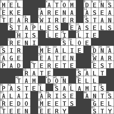 ACROSS 1. Cartoonist voice _ Blanc 4. Smallest unit of an element 8. Cub Scout units 12. Make supply last 13. Sports stadium 14. At sea 15. Pull apart 17. One who wires 18. Comedian Laurel of Laurel & Hardy 19. Paper fasteners 21. Artist's stands 23. Part of HMS, perhaps 24. Luau accessory 26. Whopper 27. Painter Guido (1575-1642) 28. _ gin 30. Title for a knight 31. Ear of corn 34. Heredity factor (abbr.) 37. Grow older 38. Consumed 39. Armed conflict 40. Groovy apt. 41. Cigar-shaped 42. Eastern Standard Time (abbr.) 43. Pace 44. Table seasoning 46. Scottish cap 47. Spanish title 50. Pipe bend 51. Soft color 54. Deli grouping 57. Mountain range southwest of Kyrgyzstan 58. Originate 60. Pismires 62. Make new 63. Confronts 64. Set 65. Adolescent 66. Suggestive of the supernatural 67. Filthy place DOWN 1. Was introduced to 2. Supplements with great effort 3. Resembling or made to resemble leather 4. Satellite of Uranus 5. Laconic 6. Single 7. Female horse 8. Hyrax 9. First name in cosmetics 10. Anneal 11. Without 13. Leather borer 16. Precipitation 20. Air pressure measure (abbr.) 22. _ vera 25. Small island 27. Port city in Latvia 29. Actor's bit 30. Plant excrement 31. Confront 32. Having ears or earlike features 33. Had dinner 34. Residences 35. Political cartoonist Thomas 36. Tate display 41. Not wild 43. Food allowance for one day 44. Ocean 45. _ mater 46. Sadhe (variant) 48. Flexible twig of a willow tree 49. Characterized by obscenity 51. Role in a play 52. Toward shelter 53. Unable to walk 55. French article 56. Proofreading order 59. To riddle 61. Roguish