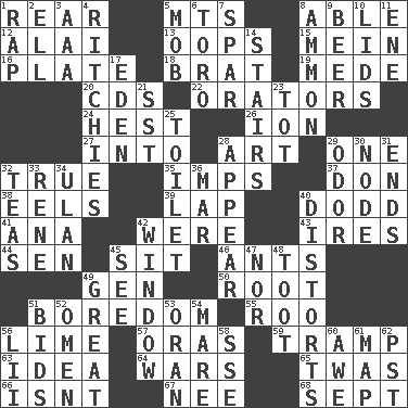 ACROSS 1. Located in or toward the back 5. Mountains (abbr.) 8. Competent 12. Mountain range southwest of Kyrgyzstan 13. I made a mistake 15. Chow _ 16. Food holder 18. Naughty child 19. Ancient Persian 20. Music discs 22. Speakers 24. Command 26. Electrically charged atom 27. To the inside or interior of 28. Tate display 29. Single 32. Loyal 35. Naughty children 37. Spanish title 38. Snakelike fish 39. Pet locale 40. Texas town _ City 41. Santa ___, CA 42. Past tense of be (plural) 43. Angers 44. Elected rep. 45. Be seated 46. Pismires 49. Commissioned mil. rank 50. Carrot, for example 51. Mood resulting from idleness 55. Friend of Pooh 56. Citrus frut 57. Mouths or openings 59. _____ steamer (cargo ship) 63. It may be bright or harebrained 64. Armed conflicts 65. It was, poetically 66. Is not 67. Born 68. Back-to-school mo. DOWN 1. Hit sharply and swiftly 2. Pipe bend 3. American Automobile Association (abbr.) 4. Actors Guy, Robert Welles, and Clint 5. Disorderly crowd 6. "Corrida" creature 7. Coast Guard woman 8. ID or VA city 9. Fermented drink made from hops 10. Hats (slang) 11. Compass dir. 14. Flight of steps 17. Locale of original sin 21. Fast jet (abbr.) 23. Small child 25. Bathroom 28. Seem 29. Aroma 30. Connecting point 31. Extremities 32. Beverages made from leaves 33. French philosopher Descartes 34. Uhlan (variant) 36. Make imperfect 40. What propaganda does 42. Light entry point 45. Perceive with the eye 47. Not either 48. A blast of a horn 49. Relatively large 51. Auction offers 52. Presage 53. Northwest Algerian city 54. Female horse 56. Cards in a Roman deck? 58. Compass dir. 60. Deep reverence 61. Atlas unit 62. Pacific Standard Time (abbr.)