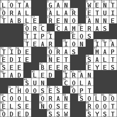 ACROSS 1. Globular water bottle used in Asia 5. Separate the seeds from cotton 8. Left 12. Spoken 13. Having or resembling wings 15. Needle holder 16. Eating place 18. Western Nevada city 19. Queen of England 1702-14 20. The grampus (Milton) 22. Devices for capturing images 24. Native american tent (variation) 26. Greek goddess of the dawn 27. Pull apart 28. Electrically charged atom 29. Call ___ day 32. Periodic rise and fall of the sea level 35. Mouths or openings 37. Atlas unit 38. Singer Brickell 39. Fish or hair follower 40. Table seasoning 41. Observe 42. Fermented drink made from hops 43. Sight organs 44. Bit 45. Directed 46. SW Asia republic 49. Player for Phoenix 50. Root beer relative 51. Opts 55. Elect 56. Calm and collected 57. NW Algerian seaport 59. Twentieth part of a lira 63. Otherwise 64. Olfactory organ 65. Carrot, for example 66. Wrote a lyric poem 67. Compass dir. 68. System (abbr.) DOWN 1. Car dealer's back yard 2. Mouth or opening 3. Keyboard key 4. One to whom something is allotted 5. Slender fish 6. Actor Baldwin 7. Grandmother 8. Erodes 9. Inactive volcano in Sicily 10. Religious women 11. Standoff 14. Lover boys 17. 4th largest of the Great Lakes 21. Tax preparer (abbr.) 23. Period of immesurable duration 25. Pressed 28. Of or pertaining to medicine 29. "If ____ say so..." 30. Story 31. Flats, for short 32. Trial 33. The main thing one is thinking about 34. Passed on 36. To separate or throw off 40. Legislators 42. Gillaume's butler role 45. Nilotic language 47. Friend of Pooh 48. High mountains 49. Having a sole or soles 51. Chilled 52. Stockings 53. Greek god of love 54. Backtalk 56. Corporate head (abbr.) 58. ___ Haven, CT 60. Myrna of the movies 61. Two (Sp.) 62. Baseball player Mel
