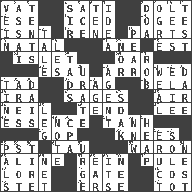 ACROSS 1. Large container 4. Suttee (variant) 8. Stupid person 12. Compass dir. 13. On the rocks 14. Double curve, resembling the letter S 15. Is not 17. French philosopher Descartes 18. Actors' quests 19. Brizilian seaport 21. One (Scot) 23. Eastern Standard Time (abbr.) 24. Small island 26. Rowing implement 28. Son of Isaac 30. Moved like an arrow 34. Small boy 37. To trail on the ground 39. Actor Lugosi 40. Retirement account (abbr.) 41. Gurus 43. Atmosphere 44. Famous astronaut Armstrong 46. Be inclined (to) 47. Area sheltered from the wind 48. Gist 51. Hyperbolic tangent 54. Grand Old Party 55. Leg joints 58. Pacific Standard Time (abbr.) 61. The 19th letter of the Greek alphabet 63. Make _____ (do battle with) 65. Place in a line 67. It's straight from the horse's mouth 71. Whine 72. Old wives' tales, e.g. 73. Yard entry 74. Music discs 75. Proofreading order 76. Celtic language 77. Small child DOWN 1. Distinctive style or manner 2. Slender Brazilian palm 3. Portable shelters 4. Title for a knight 5. Adept person 6. "___ Little Indians" 7. The content of cognition 8. ___ good deed 9. Legendary monster 10. Allows 11. Trial 16. Story 18. Lightbulb-shaped fruit 20. French article 22. Not either 25. Small amounts or degrees 27. Director Reiner 29. A salt of uric acid 30. Rep 31. Welt 32. Writer Wiesel 33. Have the gumption 34. Prong on a fork 35. Ancient Greek god of war 36. Raised platform 38. Grow older 42. Neighbor of Neb. 45. Part of a journey 49. Short letter 50. Tax preparer (abbr.) 52. Compass dir. 53. Pile 56. Spew [out] 57. Twentieth part of a lira 58. Friends 59. Narrow, elongated depression 60. Hoop that covers a wheel 62. Goad 64. Egg locale 66. Fish or hair follower 68. Ewer handle 69. ___ a Wonderful Life 70. Born