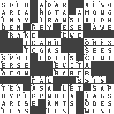 ACROSS 1. Disposed of to a purchaser 5. The sixth month of the Jewish calendar 9. In addition 13. Operatic vocal solo 14. Round or rotation of duties 15. Amid 16. "If ____ say so..." 17. Interpreter 19. Lair 20. Marina Del _, California 21. Compass dir. 22. Deep reverence 23. Immoral or dissolute person 25. She-sheep 26. Potato state 30. Singles 34. Ancient Roman robes 35. Observes 36. Specific locale 39. Proofreads 42. Penny 43. Celtic language 44. Webber/Rice musical 46. Period of immesurable duration 47. Less widely known 48. Apple computer (short form) 51. Fast planes 54. Beverage made from leaves 57. White ___ sheet 58. Allow 60. Plant excrement 62. Abnormally rapid or deep breathing 65. Labels 66. Originate 67. Pismires 68. Lyric poems 69. Afternoon social gatherings 70. For fear that 71. Compass direction DOWN 1. Alleged 2. Abalone 3. Climbing, woody, usually tropical vines 4. 24 hours 5. Johnson of "Laugh-In" 6. Rowboat 7. _ moment's notice (2 wds.) 8. Indian princess (variant) 9. Nanny (var.) 10. Globular water bottle used in Asia 11. Frozen precipitation 12. Legendary monster 15. Toward shelter 18. Compass dir. 20. Make new 24. Baby cat 27. Personal question 28. Possessed 29. Flexible twig of a willow tree 30. Motion picture awards 31. Born 32. Car or cant ending 33. Fast jet (abbr.) 36. Ocean 37. Before (prefix) 38. Bear (Spanish) 40. Federal power corp. 41. Title for a knight 45. Trial 48. Female horse 49. Cleo's killer 50. Lessep's creation 52. Sadhe (variant) 53. Gurus 54. Not this but _ 55. Jane of fiction 56. Capital of Western Samoa 58. Allows 59. 90 degrees 61. Inconspicuous attention getter 63. Curvy letter 64. Single 65. Pull behind