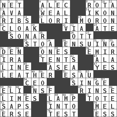 ACROSS 1. Remaining after all deductions 4. Actor Baldwin 8. Roll call or roster of names 12. Actress Gardner 13. Welt 14. Image 15. Chest bones 17. Australian parrot (variant) 18. Person of subnormal intelligence 19. Cover or conceal 21. By way of 23. Had dinner 24. Echolocation 26. Baseball player Mel 28. Portico 30. Taking place subsequently 34. Lair 37. Washington bills 39. Arab leader 40. Retirement account (abbr.) 41. Portable shelters 43. In the manner of 44. Actor's bit 46. Toward the sea 47. Affirmative reply 48. Cordwainer's material 51. Son of Isaac 54. Corporate head (abbr.) 55. Burn superficially 58. Connecticut Ivy Leaguer 61. Overdraft (abbr.) 63. Remove soap 65. Citrus fruits 67. Desk light 71. Carryall 72. Plant excrements 73. To the inside or interior of 74. Cartoonist voice _ Blanc 75. Celtic language 76. Trial 77. Curvy letter DOWN 1. Drug cop 2. Vices 3. Off limits 4. Leather borer 5. Lion 6. Hearing organ 7. 154 in Roman numerals 8. River (Sp.) 9. Gumbo ingredient 10. A blast of a horn 11. Queen of England 1702-14 16. Without 18. Floor coverings 20. Krazy ___ of comics 22. Electrically charged atom 25. Carrot, for example 27. Third day of the wk. 29. Approach 30. First name in cosmetics 31. "If ____ say so..." 32. The longest river in the world 33. Pate de foie ____ 34. Deli pickle 35. 4th largest of the Great Lakes 36. Grandmother 38. Followers of ems 42. Backtalk 45. And so on (abbr.) 49. Coop moms 50. Greek goddess of the dawn 52. Wind 53. A single undivided whole 56. Dwarf 57. _____ Park, CO 58. Otherwise 59. One who doesn't tell the truth 60. Naughty children 62. Secret move to avoid paying debts 64. Snakelike fish 66. Compass dir. 68. One (Scot) 69. Mountains (abbr.) 70. Cooking vessel