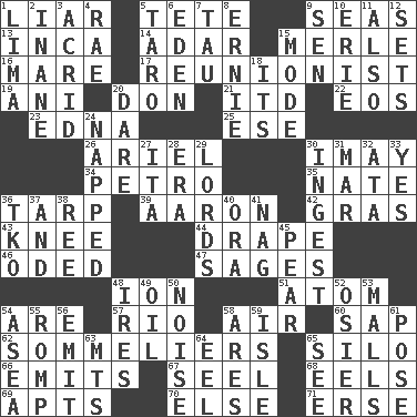 ACROSS 1. One who doesn't tell the truth 5. Wig 9. Oceans 13. South American Indian 14. The sixth month of the Jewish calendar 15. Haggard of country music 16. Female horse 17. One who advocates reunion 19. Cuckoo 20. Spanish title 21. It would 22. Greek goddess of the dawn 23. Pulitzer Prize-winning author Ferber 25. Compass dir. 26. Satellite of Uranus 30. "If ____ say so..." 34. Stone: prefix 35. Nathan's nickname 36. Canvas cover 39. Composer Copland 42. Pate de foie ____ 43. Leg joint 44. Window treatment 46. Wrote a lyric poem 47. Gurus 48. Electrically charged atom 51. Smallest unit of an element 54. "We ___ not amused" (Victoria) 57. River (Sp.) 58. Wind 60. Plant excrement 62. Wine waiters 65. Grain storage tower 66. Sends forth 67. Stitch closed the eyes of (a falcon) 68. Snakelike fish 69. Tenement units (abbr.) 70. Otherwise 71. Celtic language DOWN 1. Pale green bean 2. Lacking in sense or substance 3. Sour-tasting 4. Actress Charlotte 5. Edible starchy tuberous root 6. Genesis locale 7. The 19th letter of the Greek alphabet 8. Bert's buddy 9. Elected rep. 10. One of the Great Lakes 11. In addition 12. Arranges properly for use 15. Method 18. ___ a Wonderful Life 20. Have the gumption 24. Slept 27. Call ___ day 28. Period 29. Nobles 30. Consume 31. Third mo. 32. _ moment's notice (2 wds.) 33. Consenting reply 36. Ring climax 37. Plus 38. To sift 40. Mouth or opening 41. Tired old horse 45. Lightbulb-shaped fruit 48. Angers 49. Lubricate 50. Annoying sound 52. Flexible twig of a willow tree 53. Promenades 54. Toward the sea 55. Frolic 56. Send forth 58. Ancient Greek god of war 59. Capri or Wight 61. Airs 63. Mountains (abbr.) 64. Snakelike fish 65. Perceive with the eye