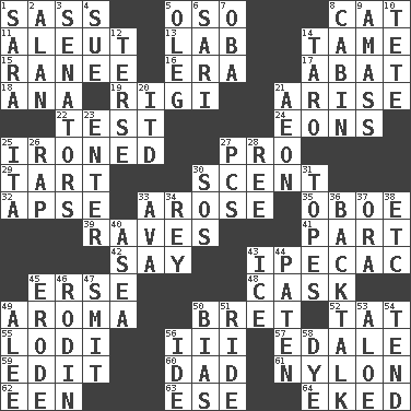 ACROSS 1. Backtalk 5. Bear (Spanish) 8. Domesticated feline 11. Eskimo relative 13. Experiment locale 14. Docile 15. The wife of a rajah (variant) 16. Epoch 17. Blind as ____ 18. Santa ___, CA 19. Swiss mountan, "Queen of the Mountains" 21. Ascend 22. Trial 24. Immeasurably long periods of time 25. Pressed 27. Adept person 29. Small pie 30. Aroma 32. Domed church section 33. Came up 35. Mitch Miller's instrument 39. All-night dance parties 41. Component 42. Declare 43. Medicinal drug used to evoke vomiting 45. Celtic language 48. Keg 49. Odor 50. Cy Young winner Saberhagen 52. Make lace 55. Farming town in central California 56. One more than two 57. Peak District village in England 59. Prepare for publication 60. June honoree 61. High-strength synthetic material 62. Car or cant ending 63. Compass dir. 64. Supplemented with great effort DOWN 1. "Two Mules for Sister ____" 2. ____ Jay Lerner 3. Elected representatives 4. Take to court 5. Cassini of fashion 6. Indian skirt 7. Chief or king in Benin or Nigeria 8. Apartment or room in a ship 9. Collect or gather 10. Wig 12. Laconic 14. Edible starchy tuberous root 20. It would 21. A really long time 23. Keyboard key 25. Call ___ day 26. Reproach for some lapse or misdeed 27. Personal Computers (abbr.) 28. To separate or throw off 30. Distress signal 31. Drinks excessively 33. Actress Gardner 34. Marina Del _, California 36. Sass 37. Mouth or opening 38. And so on (abbr.) 40. At sea 43. Frozen water 44. Eucharist need 45. Eat (away) 46. "The Thinker" sculptor 47. Stricken, poetically 49. Toward shelter 50. Prejudice 51. Travel on or in a vehicle 53. _ vera 54. Look after 56. Binary compound 58. Color