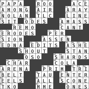 ACROSS 1. Dad 5. Friend of Pooh 8. Adept person 11. Amid 13. Atmosphere 14. Like ___ of sunshine 15. Pitcher Ryan 16. Affectionate concern, for short 17. Actor's bit 18. Be seated 19. Lyric poems 21. Collect or gather 22. San ____ (Riviera town) 24. Patter 25. Eats (away) 27. For each 29. The Jewish people; Israel 30. NE Netherlands city 32. Pulitzer Prize-winning author Ferber 33. Prepares for publication 35. American tennis player Robert 39. Yell 41. Comedian Laurel of Laurel & Hardy 42. Bear (Spanish) 43. Pottery fragments 45. Burn to charcoal 48. Root beer relative 49. Sports stadium 50. Demure 52. Three (prefix) 55. Waist strap 56. The 19th letter of the Greek alphabet 57. Keyboard key 59. Snakelike fish 60. 100% 61. Biscuitlike quick bread 62. Ring climax 63. Madame (abbr.) 64. Washington bills DOWN 1. Zero-star reviews 2. Mine, in Marseilles 3. Coward 4. Santa ___, CA 5. Pace 6. Lubricates 7. The grampus (Milton) 8. Believer in; advocate of (suffix) 9. 2nd pers. sing. pres. of can (arch.) 10. Snake ____ (dice throw) 12. Dwarf 14. _ mater 20. Two (Sp.) 21. 1/640 square mile 23. Ferber et al. 25. Compass dir. 26. To free from 27. Pacific Standard Time (abbr.) 28. Double-curved letter 30. Small island 31. Relating to the nose 33. Greek goddess of the dawn 34. Superhero pair 36. Ski resort town in Vermont 37. Possessed 38. Followers of ems 40. Israeli folk dance 43. _-fi 44. Dwellings 45. Small stream 46. Phone greeting 47. Pismires 49. Collude with 50. Inside of hand 51. Court order 53. French philosopher Descartes 54. Angers 56. Scottish cap 58. Non-commissioned officer (abbr.)