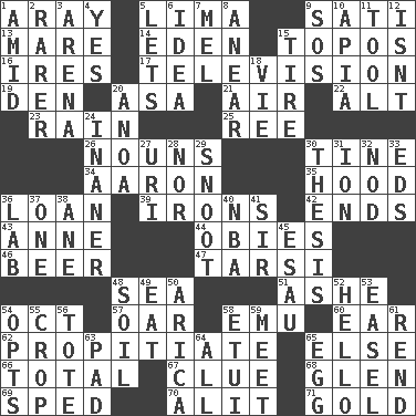 ACROSS 1. Like ___ of sunshine 5. Pale green bean 9. Suttee (variant) 13. Female horse 14. Genesis locale 15. Literary convention 16. Angers 17. Household entertainment appliance 19. Lair 20. White ___ sheet 21. Atmosphere 22. The first octave above the treble staff 23. Precipitation 25. To riddle 26. Parts of speech 30. Prong on a fork 34. Composer Copland 35. Parka part 36. Grant temporary use of 39. Removes the wrinkles 42. Extremities 43. Queen of England 1702-14 44. Off-Broadway awards 46. Fermented drink made from hops 47. Tarsus (plural) 48. Ocean 51. American tennis player Robert 54. Sep. follower 57. Rowing implement 58. Australian flightless bird 60. Hearing organ 62. Conciliate 65. Otherwise 66. Add up to 67. A slight indication 68. Small, secluded valley 69. Moved rapidly 70. Came down and settled, as after flight 71. Gilded DOWN 1. Among 2. Less widely known 3. Sports stadium 4. Consenting reply 5. Allows 6. It may be bright or harebrained 7. Cartoonist voice _ Blanc 8. Approach 9. Distress signal 10. Capital of Western Samoa 11. Instrument 12. Is not 15. Hoop that covers a wheel 18. Compete 20. Small Philippine buffalo 24. More empty; more void 27. RI univ. 28. And not 29. Snout, nose 30. College paper 31. Electrically charged atom 32. Lower and raise head in agreement 33. Begley and Asner 36. Experiment locale 37. Single 38. One (Scot) 40. Basketball assoc. 41. Title for a knight 45. He sold his birthright 48. Earth 49. Erode 50. N. Chile seaport 52. Phone greeting 53. Artist's stand 54. Chooses 55. Riding implement 56. Carryall 58. Needle holder 59. Rendezvous 61. Tear apart 63. Groovy apt. 64. Everything 65. Oval reproductive body of a fowl