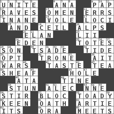 ACROSS 1. Join together 6. Santa ___, CA 9. Infant food 12. All-night dance parties 13. Sign of something about to happen 14. Blunders 15. Lacking in sense or substance 16. Short-tailed, large-bodied rat 17. Venues 18. Plus 19. To provide with a ceiling 20. High mountains 21. Liveliness 23. Cards in a Roman deck? 24. Paradise 25. Hauls 28. Manchild 30. Sadhe (variant) 34. Periodic rise and fall of the sea level 35. Choose 36. Marketplace scale 38. Small island 39. Armed conflicts 41. Clothes sense 43. Beverage made from leaves 44. Archer's quiver 46. Opening into or through something 48. _ moment's notice (2 wds.) 49. Prong on a fork 50. Astound 51. Actor Baldwin 53. Compass dir. 56. Move through with a circular motion 57. Alliance 58. Sycophant 60. Peachy ____! 61. Pledge 62. Nick name for Arthur 63. It is 64. Mouth or opening 65. Confronts DOWN 1. RI univ. 2. Nanny 3. _ the terrible 4. Looked after 5. Compass dir. 6. Mine, in Marseilles 7. 1994 drama film starring Jodie Foster 8. One (Scot) 9. Appease 10. Curves 11. 23rd letter of the Greek alphabet 13. Baking chamber 14. American author Paul (1891-1958) 19. 2nd pers. sing. pres. of can (arch.) 20. The first octave above the treble staff 22. Allow 24. Pleas 26. Singer Brickell 27. Bristle 28. Sty mamas 29. Brightly colored fish 31. Nonscientific branch of learning 32. ___ good deed 33. Followers of ems 37. Value system 40. Titan orbits this 42. Period of immesurable duration 45. Air blower 47. Poe poem 49. Technical 50. Proofreading order 51. Having or resembling wings 52. Globular water bottle used in Asia 54. Nathan's nickname 55. Prepare for publication 56. What Jean-Claude Killy likes to do 57. Surprise greeting 58. Scottish cap 59. Affirmative reply
