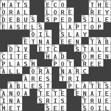 ACROSS 1. Floor protectors 5. Environmental prefix 8. Definite Article 11. Relating to the mouth 12. Old wives' tales, e.g. 14. Marina Del _, California 15. Alight from a bus 17. Broke a traffic law 18. Filth; sediment 19. Artist's stands 21. Portable computer 23. Petroleum 25. Kill 26. Inactive volcano in Sicily 27. Car or cant ending 28. Bar bill 31. HTML Container Element 33. And so on (abbr.) 35. Having lost freshness 37. Quote 38. Possessed 40. Presage 41. Suffix with ecto or cyto 43. Cooking vessel 45. To separate or throw off 46. Everything 47. Mouth or opening 50. Drug cop 52. Ancient Greek god of war 53. Three (prefix) 54. Most capable 56. Food holders 61. Small Philippine buffalo 62. False hair 65. Maternal 66. _ tizzy (2 wds.) 67. Indian titles of respect 68. Loyal 69. Was introduced to 70. Observe 71. The visible part of the earth's surface DOWN 1. Method 2. Length times width 3. Bar bills 4. Turn sharply 5. Raised railways 6. Police officer (slang) 7. Threatening words 8. Musical group of three 9. Aid 10. Sight organ 13. Peak District village in England 16. Narrow opening 18. Filthy place 20. Trig term 22. Baking dishes 24. Thin strip of wood or metal 26. Nights before holidays 28. Not wild 29. Toward shelter 30. Benjamin's nick name 31. Deli pickle 32. Slanted text style (abbr.) 34. Head covering 36. Torque (variant) 37. Accounting whiz (abbr.) 39. Do not 42. Greater amount 44. Canvas cover 48. Musical pauses 49. Michaelmas daisies 51. Cause heat under the collar 52. According to 54. Queen of England 1702-14 55. Water vessel 57. Pismires 58. Edible starchy tuberous root 59. Needle holder 60. Stitch closed the eyes of (a falcon) 61. Direct toward a target or goal 63. Neckwear 64. Compass dir.