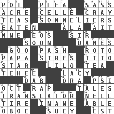 ACROSS 1. Luau course 4. Entreaty 8. Backtalk 12. 43,560 square feet 14. Cell (Danish) 16. Supercomputer manufacturer 17. Afternoon social gatherings 18. Wine waiters 20. Consumed 22. Insect wing 23. Small island 24. Compass dir. 25. Greek goddess of the dawn 28. Title for a knight 30. Within a short period 31. Natives or inhabitants of Denmark 35. Thick or sticky substance 37. Romantic infatuation 40. Printing process, for short 41. Dad 42. Begets 44. "Tell ____ the Marines!" 45. Play the lead 46. _ and Stitch 47. Beverage made from leaves 48. Giggle 50. Made of lace 52. Pat or tap gently 54. Mouth or opening 55. 23rd letter of the Greek alphabet 58. Sep. follower 61. Reproach for some lapse or misdeed 63. Stories 65. Interpreter 70. 1994 drama film starring Jodie Foster 71. Become fatigued 72. Empty; void 73. Competent 74. Mitch Miller's instrument 75. Chop _ 76. Eastern Standard Time (abbr.) DOWN 1. Eucharist need 2. Sea 3. Feeling or showing extreme anger 4. Personal Computers (abbr.) 5. Lion 6. Shade tree 7. _ mater 8. _-fi 9. Length times width 10. Indian skirt 11. System (abbr.) 13. Compass dir. 15. Snakelike fish 19. Put down 21. Modern: prefix 26. I made a mistake 27. Slow-paced one 29. Noteworthy scarcity 30. Flew 32. Musical sound 33. Singer James 34. "Barney Miller" actor Jack 35. Yard entry 36. Brightly colored fish 38. Indian title of respect (Mr.) 39. Phone greeting 41. Pacific Standard Time (abbr.) 43. Fly high 49. Hearing organs 51. Domesticated feline 53. Indonesian resort city 55. Military trainee 56. Makes a sale 57. Small island 58. "Beetle Bailey" pooch 59. Baby bed with high sides 60. Pacific island yam 62. Zero-star reviews 64. Santa ___, CA 66. Born 67. The 19th letter of the Greek alphabet 68. Single 69. Marina Del _, California