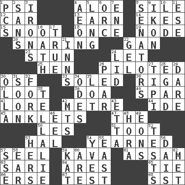 ACROSS 1. Air pressure measure (abbr.) 4. Medicinal plant 8. Drop; flow; fall 12. Auto 13. Merit 14. Supplements with great effort 15. Snout, nose 18. Single time 19. Thickened enlargement 20. Catching in a trap 22. Separate the seeds from cotton 23. Make senseless or dizzy 24. Allow 25. Layer 26. Manned the helm 30. Order of Saint Francis (abbr.) 33. Having a sole or soles 36. Port city in Latvia 37. Spoils 39. ___ good deed 40. Practice fight 41. Old wives' tales, e.g. 42. Distance measurement (Brit.) 44. Binary compound 45. Short socks 47. Definite Article 50. French article 51. A blast of a horn 53. Actor Linden 54. Had a strong desire 57. Sew up the eyelids of hawks and falcons 59. Polynesian shrub of the pepper family 61. Indian state 63. Indian skirt 64. Ancient Greek god of war 65. Standoff 66. Celtic language 67. Trial 68. Fast jet (abbr.) DOWN 1. Personal Computers (abbr.) 2. Without 3. Metal shackles 4. Period of immesurable duration 5. Austrian-born American filmmaker Fritz 6. The grampus (Milton) 7. Compass dir. 8. Elected representatives 9. Picture 10. Directed 11. Compass dir. 16. Pledge 17. Loyal 21. Lodging establishments 22. Set 24. Hat (slang) 26. Lightbulb-shaped fruit 27. Native american tent (variation) 28. Mild oath 29. Have the gumption 30. Spanish pot 31. Within a short period 32. Tined utensil 34. Lyric poems 35. Car dealer's back yard 38. Copy Pinocchio 42. Mountains (abbr.) 43. Singer James 46. Snakelike fish 48. Israeli folk dance 49. Immeasurably long periods of time 52. Trials 53. Possessive pronoun 54. Jacques Cousteau's middle name 55. Compass direction 56. Raised platform 57. Compass dir. 58. Ewer handle 59. Krazy ___ of comics 60. "We ___ not amused" (Victoria) 62. Was introduced to