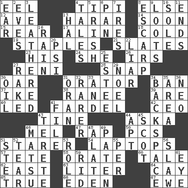 ACROSS 1. Snakelike fish 4. Native american tent (variation) 8. Otherwise 12. "___ Maria" 13. Ethiopian city, capital of Harari 14. Within a short period 15. Hitchcock's "____ Window" 17. Place in a line 18. Having a low temperature 19. Paper fasteners 21. Chalkboards 23. Part of HMS, perhaps 24. A female animal or person 26. Big collection agency 27. Painter Guido (1575-1642) 28. Fastener 30. Rowing implement 31. Speaker 34. Prohibit 37. Mamie's husband 38. The wife of a rajah (variant) 39. "We ___ not amused" (Victoria) 40. Directed 41. Pack 42. Corporate head (abbr.) 43. Prong on a fork 44. "____ silly question..." 46. Cartoonist voice _ Blanc 47. Reproach for some lapse or misdeed 50. Personal Computers (abbr.) 51. A viewer who gazes fixedly 54. Portable computers 57. Wig 58. Declaim 60. Falsehood 62. Compass direction 63. 61 cubic inches 64. Island 65. Loyal 66. Locale of original sin 67. She-sheep DOWN 1. Ewer handle 2. Nights before holidays 3. Resembling or made to resemble leather 4. Stories 5. From or relating to Ireland 6. Baking dish 7. Angers 8. Fortification 9. Plunders 10. Flatfish 11. Conclusions 13. Actor Linden 16. Water falling in drops from the sky 20. 23rd letter of the Greek alphabet 22. One who doesn't tell the truth 25. First name in cosmetics 27. Libertine 29. Christmas carol 30. Petroleum 31. NW Algerian seaport 32. More valued for its uncommonness 33. Added to 34. Keyboard key 35. Type of rug 36. Modern: prefix 41. Do some clerical work 43. Cylindrical with tapered ends 44. Fitting 45. Native of Scotland 46. Taiwanese island in East China Sea 48. Having winglike extensions 49. Eucharist need 51. Proofreading order 52. Separate forcefully 53. Hero or heavy, e.g. 55. For each 56. Cole _ (cabbage dish) 59. To free from 61. Sight organ