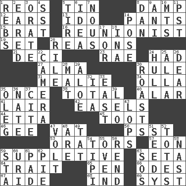 ACROSS 1. Vintage cars 5. Shallow baking pan 8. Moist 12. Hearing organs 13. Wedding promise 14. Leg coverings 15. Naughty child 16. One who advocates reunion 19. Put into a specified state 20. Thinks logically 21. Tenth: prefix 23. Actress Charlotte 24. Possessed 27. _ mater 30. Court order 31. Ear of corn 34. Water jar 35. Single time 38. "_____ Recall" 40. Having or resembling wings 41. Den 42. Artist's stands 44. Singer James 45. A blast of a horn 46. Unit of force equal to gravity 47. Large container 50. Inconspicuous attention getter 53. Speakers 57. A really long time 59. Supplementary 63. Stalk of a moss capsule 64. Distinguishing feature 65. Animal enclosure 66. Lyric poems 67. Assistant 68. Indiana (abbr.) 69. System (abbr.) DOWN 1. Confederate soldiers (slang) 2. Having ears or earlike features 3. Speak pompously 4. Fast jet (abbr.) 5. Hoop that covers a wheel 6. It may be bright or harebrained 7. Common sense 8. Daniel's nick name 9. Black tropical American cuckoo 10. Mountains (abbr.) 11. Pacific Standard Time (abbr.) 14. Airs 17. Not either 18. _ tizzy (2 wds.) 20. Cause heat under the collar 22. Device for capturing images 24. Frame or body of a ship 25. Silent film actress Nazimova 26. Letter starter 28. Floor protector 29. Medicinal plant 30. Exposes to great heat 32. Call ___ day 33. Compass direction 35. Cassini of fashion 36. Nathan's nickname 37. Quote 39. Lion 43. Chops off 47. Electrical Unit 48. "We ___ not amused" (Victoria) 49. Make lace 51. Morally degraded 52. Hauls 54. Native american tent (variation) 55. Baking chamber 56. Tear apart 58. Political cartoonist Thomas 59. R.R. building 60. RI univ. 61. Groovy apt. 62. Sliced dessert 63. Mayday