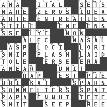ACROSS 1. Housemaid (var.) 4. Slanted text style (abbr.) 8. Puts into a specified state 12. Female horse 14. Nothings 16. It may be bright or harebrained 17. Johnson of "Laugh-In" 18. Pleas 20. Vertical member of a panel or frame 22. She-sheep 23. Followers of ems 24. Compass dir. 25. Sodium hydroxide 28. Immediately 30. Actor Baldwin 31. Relating to the nose 35. Cleo's killer 37. Locales 40. Australian parrot (variant) 41. Clip 42. Suffix with ecto or cyto 44. Put down 45. Lacquered or enameled metalware 46. Celtic language 47. Period 48. Approach 50. A single undivided whole 52. Reproach for some lapse or misdeed 54. Eastern Standard Time (abbr.) 55. Sliced dessert 58. RI univ. 61. Krazy ___ of comics 63. Practice fights 65. Wine waiters 70. Argument over a trivial matter 71. Dad 72. World-weariness 73. False hair 74. Stricken, poetically 75. Ooze 76. Portuguese money of account (variant) DOWN 1. Collect or gather 2. Shops 3. Nick name for Arthur 4. Ending with capital 5. "___ Little Indians" 6. Nonscientific branch of learning 7. Old wives' tales, e.g. 8. Be seated 9. Singer Brickell 10. Adolescent 11. Backtalk 13. Snakelike fish 15. Stitched 19. A really long time 21. Pipe bend 26. Sharp bark 27. Learning spot: Fr. 29. Place for singles 30. Seem 32. Fly high 33. Operatic vocal solo 34. Flaplike covering 35. At once, immediately (arch.) 36. Drop; flow; fall 38. 4-wheeled motor vehicle 39. Come out of 41. R.R. building 43. Not women's 49. Libertine 51. It is 53. Diluted with white 55. Some stationery 56. Feeling or showing extreme anger 57. First name in cosmetics 58. United States Postal Service (abbr.) 59. Wander aimlessly 60. Body of Kaffir warriors 62. Airtight sealed metal containers 64. Pacific Standard Time (abbr.) 66. Floor covering 67. Compass dir. 68. Sorrow 69. Small drink