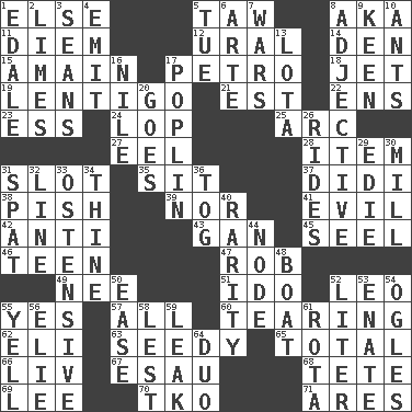 ACROSS 1. Otherwise 5. The 23rd letter of the Hebrew alphabet 8. Alias (abbr.) 11. South Vietnam president (1954) 12. Mountain range 14. Lair 15. With great haste 17. Stone: prefix 18. Passenger plane 19. Small, flat, pigmented spot on the skin 21. Eastern Standard Time (abbr.) 22. Followers of ems 23. Double-curved letter 24. Chop off 25. Curve 27. Snakelike fish 28. Detail 31. Slit 35. Be seated 37. "You Light Up My Life" star Conn 38. Expression of disdain 39. And not 41. Morally bad or wrong 42. Against 43. Separate the seeds from cotton 45. Stitch closed the eyes of (a falcon) 46. Adolescent 47. Director Reiner 49. Born 51. Wedding promise 52. Lion 55. It is so 57. Everything 60. Pulling into pieces 62. Biblical high priest 63. Shabby and untidy 65. Add up to 66. 54 in ancient Rome 67. He sold his birthright 68. False hair 69. Area sheltered from the wind 70. Ring climax 71. Ancient Greek god of war DOWN 1. Peak District village in England 2. Citrus fruits 3. Seines 4. Give off 5. Third day of the wk. 6. Johnson of "Laugh-In" 7. Armed conflicts 8. Descriptive word 9. Peachy ____! 10. Pismires 13. Globular water bottle used in Asia 16. The longest river in the world 17. Cotton for raincoats, e.g. 20. Moves 26. Amusement-park features 29. Singer Brickell 30. Place where flour is made 31. Petty quarrel 32. Actor's bit 33. Clearly or manifestly demonstrative 34. One or ones belonging to thee 36. Coat; cloak 40. Noteworthy scarcity 44. Thickened enlargement 48. Water vessel 50. Relaxation 52. 61 cubic inches 53. Maternal 54. Stares at amorously 55. Shout 56. Writer Wiesel 58. For fear that 59. Path through which fluid escapes 61. Round or rotation of duties 64. Superhero pair