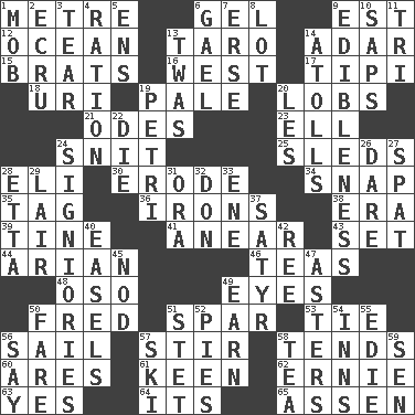 ACROSS 1. Distance measurement (Brit.) 6. Set 9. Eastern Standard Time (abbr.) 12. Sea 13. Edible starchy tuberous root 14. The sixth month of the Jewish calendar 15. Naughty children 16. 270 degrees 17. Native american tent (variation) 18. RI univ. 19. Light colored 20. Tennis shots 21. Lyric poems 23. Pipe bend 24. In a ____ (agitated or irritated) 25. Bobsleighs 28. Biblical high priest 30. Wear away 34. Fastener 35. Label 36. Metal shackles 38. Period 39. Prong on a fork 41. Approach 43. Arrange properly for use 44. Believer in; advocate of (suffix) 46. Beverages made from leaves 48. Bear (Spanish) 49. Sight organs 50. Flintstone 51. Practice fight 53. Make a knot 56. Move on water 57. Commotion 58. Is inclined (to) 60. Ancient Greek god of war 61. Peachy ____! 62. Bert's buddy 63. Consenting reply 64. ___ a Wonderful Life 65. NE Netherlands city DOWN 1. Disorderly crowd 2. Shade of tan 3. Lacerate 4. Food allowance for one day 5. Followers of ems 6. Highlander 7. Celtic language 8. Car dealer's back yard 9. The property of being fit to eat 10. Plant excrements 11. Three (prefix) 13. It was, poetically 14. Ringlike coral islands and reefs 19. _ dish (used to culture cells) 20. French article 22. Expire 24. Seigniories (variant) 26. Have the gumption 27. Petty quarrel 28. Singer James 29. Den 31. Mouth or opening 32. Spanish title 33. Compass dir. 37. Letch 40. Artist's stands 42. To riddle 45. Dreamland 47. Michaelmas daisies 49. Merit 50. Conductor's collection 51. Proofreading order 52. Sliced desserts 54. Restaurants 55. Singer Brickell 56. Declare 57. What Jean-Claude Killy likes to do 58. Beverage made from leaves 59. Elected rep.