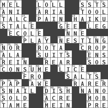 ACROSS 1. Cartoonist voice _ Blanc 4. Hang loosely or laxly 8. Fast planes 12. Black tropical American cuckoo 13. Roberta Peters solo 14. Instrument 15. Baby powder 17. Ache 18. Japanese verse 19. Showing deterioration from age 21. Turn to the right 23. Part of a journey 24. Learning spot: Fr. 26. Compass dir. 28. Live dramatic performance 30. Nestling 34. And not 37. Roll call or roster of names 39. Riding implement 40. According to 41. Costumes for special activities 43. Followers of ems 44. It's straight from the horse's mouth 46. Tail end 47. Mayday 48. Ingest 51. Louse (plural) 54. Back 55. Table seasonings 58. Infant food 61. Deep reverence 63. Less widely known 65. Slow-paced one 67. Food container 71. Billionth: prefix 72. Exchanged or delivered for money 73. Measure of real estate 74. Disorderly crowd 75. Not wild 76. Chow _ 77. Before (prefix) DOWN 1. Floor protectors 2. Maternal 3. Pale purple color 4. Pet locale 5. Mouth or opening 6. Cards in a Roman deck? 7. Austrian-born American filmmaker Fritz 8. R.R. building 9. Earth 10. Puff or smoke 11. Strike heavily 16. Hoof sound 18. Coop moms 20. Pipe bend 22. Compass dir. 25. Hearing organs 27. And so on (abbr.) 29. You are 30. Relating to or accompanying birth 31. Angers 32. Words to Nanette 33. Global Positioning Systems (abbr.) 34. Drug cop 35. Butter sub 36. Precipitation 38. Make a knot 42. Indian titles of respect 45. Overdraft (abbr.) 49. Mountain range 50. Cut the grass 52. Auto 53. Liveliness 56. _____ steamer (cargo ship) 57. Sir (Sp.) 58. Inconspicuous attention getter 59. Small Philippine buffalo 60. Inside of hand 62. Dutch treat 64. Loose flowing garment 66. Binary compound 68. Frozen water 69. _ Lanka 70. Layer