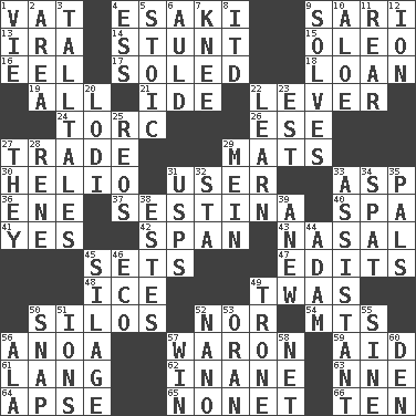 ACROSS 1. Large container 4. 1973 Nobel Price Winner (Physics) Leo 9. Indian skirt 13. Lyricist Gershwin 14. Check the growth or development of 15. Margarine 16. Snakelike fish 17. Having a sole or soles 18. Grant temporary use of 19. Everything 21. Binary compound 22. Prying instrument 24. Torque (variant) 26. Compass dir. 27. Barter 29. Floor protectors 30. Sun: prefix 31. One who uses or employs something 33. Cleo's killer 36. Compass dir. 37. French poetic form 40. Health resort 41. Affirmative reply 42. Connect, as a bridge 43. Rhinal 45. Puts into a specified state 47. Prepares for publication 48. Frozen water 49. It was, poetically 50. Grain storage towers 52. Not either 54. Mountains (abbr.) 56. Small Philippine buffalo 57. Make _____ (do battle with) 59. Help 61. Long (Scottish) 62. Silly 63. Compass dir. 64. Domed church section 65. Music written for nine 66. Nine, plus one DOWN 1. Compete 2. Type of rug 3. Baron Munchausen's specialties 4. Curvy letter 5. Unemotional 6. Old (Scot.) 7. Leg joint 8. It would 9. Finds the solution 10. Medicinal plant 11. Stern 12. Electrically charged atom 20. Farming town in central California 22. Acquire or gain knowledge or skills 23. Eastern Standard Time (abbr.) 25. Vintage cars 27. Those people 28. French philosopher Descartes 29. Count _ (2 wds.) 31. United States Postal Service (abbr.) 32. R.R. building 33. Helper 34. Petty quarrel 35. Friends 38. _____ Park, CO 39. Afresh 44. First man 45. Fodder prepared in a silo 46. Environmental prefix 49. Heavy duty weighing machine 50. Fastener 51. Charged particles 52. Billionth: prefix 53. Northwest Algerian city 55. Trig term 56. Chicken ___ king 57. Victory 58. Remaining after all deductions 60. Lair
