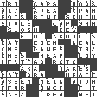 ACROSS 1. Three (prefix) 4. Smile enhancers 8. Expressions of contempt or scorn 12. Help 13. Length times width 14. Brightly colored fish 15. Leaves 17. Painter Guido (1575-1642) 18. 180 degrees 19. Having lost freshness 21. Head covering 23. Quiet! 24. Agitate, as a liquid 26. Morning condensation 28. Needle holder 30. Inveterate users 34. Domesticated feline 37. Locale of original sin 39. Anneal 40. Single 41. Natives or inhabitants of Denmark 43. Retirement account (abbr.) 44. Washington bills 46. Pile 47. Myrna of the movies 48. Small, flat, pigmented spot on the skin 51. Printing process, for short 54. Alias (abbr.) 55. Receives possession of 58. Floor protector 61. Mouth or opening 63. A salt of uric acid 65. NE Netherlands city 67. Count _ (2 wds.) 71. Tiny particle 72. Lightbulb-shaped fruit 73. At one time in the past 74. Connecticut Ivy Leaguer 75. "Two Mules for Sister ____" 76. The content of cognition 77. Remaining after all deductions DOWN 1. Labels 2. Disturbances 3. Perfect 4. Automobile 5. "We ___ not amused" (Victoria) 6. Writing instrument 7. Ketch in the Levant 8. Oct. 31 cry 9. Musical composition 10. Pledge 11. Quiet! 16. _ gin 18. Broke a traffic law 20. Eastern Standard Time (abbr.) 22. Find the sum of 25. Took on color 27. Acquire through effort 29. Potato state 30. Approach 31. To provide with a ceiling 32. Edible starchy tuberous root 33. Kill 34. Calm and collected 35. Singer Murray 36. Adolescent 38. Compass dir. 42. Specific locale 45. R.R. building 49. Picture 50. Slender fish 52. The 19th letter of the Greek alphabet 53. Gumbo ingredient 56. Consumed 57. Took without asking 58. Atlas contents 59. Toward the sea 60. Russian ruler of old 62. Mine, in Marseilles 64. Give off 66. Period 68. Conclude 69. Frozen water 70. Teachers' org.
