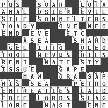 ACROSS 1. Product of festering 4. Fly high 8. Globular water bottle used in Asia 12. Of or related to the anus 14. Flexible twig of a willow tree 16. Tending to cause great harm 17. Filth; sediment 18. Wine waiters 20. Sycophant 22. Single 23. Modern: prefix 24. Conclude 25. Night before a holiday 28. And so on (abbr.) 30. At sea 31. Broken piece 35. Set 37. "Tell ____ the Marines!" 40. Butter sub 41. Implement 42. Mole, birthmark 44. Lubricates 45. Painter Guido (1575-1642) 46. Nathan's nickname 47. Filthy place 48. Come out of 50. Open wide 52. Informal term for the mouth 54. Mouth or opening 55. Plant excrement 58. Part of HMS, perhaps 61. Ocean 63. Stone: prefix 65. Pleas 70. Put down 71. Singer Brickell 72. Titled peers of a realm 73. Volcanic refuse 74. Old wives' tales, e.g. 75. Vertical spar for supporting sails 76. Compass dir. DOWN 1. Thick mixture 2. The state of being joined or united 3. First course 4. Mayday 5. Bear (Spanish) 6. Direct toward a target or goal 7. San ____ (Riviera town) 8. Flowery wreath 9. Baking chamber 10. Become fatigued 11. In addition 13. Directed 15. French philosopher Descartes 19. Allows 21. It is so 26. Distinctive style or manner 27. Eroded 29. Opt 30. Plant genus of onion and garlic 32. Set down 33. Trust 34. Two (Sp.) 35. Moves 36. Immeasurably long periods of time 38. Federal power corp. 39. Outlay 41. Three (prefix) 43. Singe 49. Relaxation 51. Infant food 53. Welt 55. Having lost freshness 56. Believer in; advocate of (suffix) 57. Porridge 58. Person who is morally reprehensible 59. _ china 60. Tumult 62. Smallest unit of an element 64. Raised railways 66. Portuguese money of account (variant) 67. Lyricist Gershwin 68. Begley and Asner 69. Fast jet (abbr.)