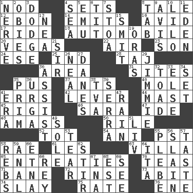 ACROSS 1. Dreamland 4. Puts into a specified state 8. Falsehood 12. Inky black, to poets 14. Gives off 16. Enthusiastic 17. Travel on or in a vehicle 18. Car 20. Viva Las _ 22. Wind 23. Boy, to dad 24. Compass dir. 25. Working for oneself (abbr.) 28. _ Mahal 30. Type of rug 31. Locates 35. Fluid product of inflammation 37. Pismires 40. Undercover agent 41. Blunders 42. Prying instrument 44. Vertical spar for supporting sails 45. Swiss mountan, "Queen of the Mountains" 46. "Two Mules for Sister ____" 47. Binary compound 48. Collect or gather 50. Cause heat under the collar 52. Small child 54. Cuckoo 55. Pacific Standard Time (abbr.) 58. Actress Charlotte 61. French article 63. Country estate 65. Pleas 70. Beverages made from leaves 71. Object of repulsion 72. Remove soap 73. "This won't hurt ____!" 74. Kill 75. Pace 76. Compass dir. DOWN 1. Impudent aggressiveness 2. Off-Broadway awards 3. Evade 4. Ocean 5. Australian flightless bird 6. Teat (slang) 7. Portico 8. Bar bill 9. Opinion 10. _ and Stitch 11. Genesis locale 13. Teachers' org. 15. Stricken, poetically 19. Mouths or openings 21. Title for a knight 26. Anneal 27. Natives or inhabitants of Denmark 29. Stevie Ray Vaughan's brother 30. Aid 32. Frog relative 33. Otherwise 34. Arrange properly for use 35. Demure 36. Capital and largest city of Mongolia 38. Federal power corp. 39. Father Junipero _ 41. Period 43. Water falling in drops from the sky 49. Not divided or shared with others 51. 54 in ancient Rome 53. Pull into pieces 55. First-year military academy student 56. Killed 57. Clothes sense 58. Confederate soldiers (slang) 59. Of or related to the anus 60. Inactive volcano in Sicily 62. Use a swizzle stick 64. Call ___ day 66. Marina Del _, California 67. _ tizzy (2 wds.) 68. Eastern Standard Time (abbr.) 69. Observe