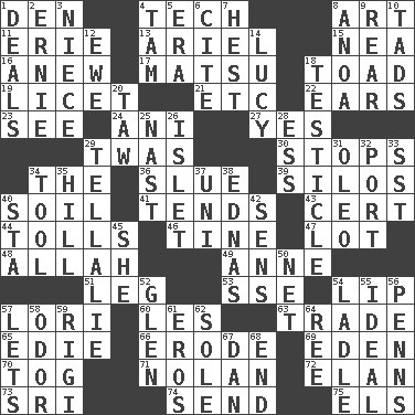 ACROSS 1. Lair 4. Technical work 8. Nonscientific branch of learning 11. One of the Great Lakes 13. Satellite of Uranus 15. Teachers' org. 16. Afresh 17. Taiwanese island in East China Sea 18. Frog relative 19. It is permitted: Lat. 21. And so on (abbr.) 22. Hearing organs 23. Observe 24. Black tropical American cuckoo 27. Consenting reply 29. It was, poetically 30. Closes up, plugs up 34. Definite Article 36. Change direction abruptly 39. Grain storage towers 40. Earth 41. Looks after 43. An absolute certainty 44. For Whom the Bell _____ 46. Prong on a fork 47. Car dealer's back yard 48. Assad's deity 49. Queen of England 1702-14 51. Part of a journey 53. Compass dir. 54. Mouth edge 57. Australian parrot (variant) 60. French article 63. Buy and sell 65. Singer Brickell 66. Eat (away) 69. Paradise 70. Coat; cloak 71. Pitcher Ryan 72. Flair 73. Indian title of respect (Mr.) 74. Post 75. Raised railways DOWN 1. Allots cards 2. Bert's buddy 3. Sibling's daughter 4. Scottish cap 5. Period 6. Quote 7. Command 8. Small Philippine buffalo 9. Tail end 10. Bits 12. She-sheep 14. "I Love _" 18. A testis 20. The 23rd letter of the Hebrew alphabet 25. Political cartoonist Thomas 26. Small island 28. Curvy letter 29. Copy Pinocchio 31. Margarine 32. Left side of a ship or aircraft 33. Fast jet (abbr.) 34. Utensil 35. Land elevation 37. University (slang) 38. Ferber et al. 40. R.R. building 42. Elected reps. 45. A female animal or person 50. Fish or hair follower 52. Small, secluded valley 54. Dipping utensil 55. Standard of perfection 56. Actor Sean's family 57. Allows 58. Aroma 59. Swiss mountan, "Queen of the Mountains" 61. Greek god of love 62. Not divided or shared with others 64. Portuguese money of account (variant) 67. One of the 12 tribes of Israel 68. Conclude
