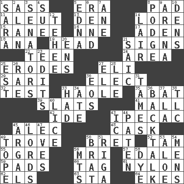 ACROSS 1. Backtalk 5. Period 8. Writing tablet 11. Eskimo relative 13. Lair 14. Old wives' tales, e.g. 15. Indian princess (variant) 16. Compass dir. 17. Arabian gulf 18. Santa ___, CA 19. Froth on beer 21. Attaches a signature 22. Adolescent 24. Length times width 25. Eats (away) 27. Connecticut Ivy Leaguer 29. Indian skirt 30. Choose 32. Trial 33. White Person, in Hawaii 35. Blind as ____ 39. Narrow boards 41. Shopping center 42. Binary compound 43. Medicinal drug used to evoke vomiting 45. Actor Baldwin 48. Keg 49. Collection of objects 50. Cy Young winner Saberhagen 52. Scottish cap 55. Legendary monster 56. Medical imaging device (abbr.) 57. Peak District village in England 59. Writing tablets 60. Label 61. High-strength synthetic material 62. Raised railways 63. R.R. building 64. Makes supply last DOWN 1. "Two Mules for Sister ____" 2. Actor Alda or Thicke 3. Legislators 4. Take to court 5. Pulitzer Prize-winning author Ferber 6. Tear apart 7. One (Scot) 8. Puddle 9. Sports stadium 10. Habitations of wild animals 12. Giggle 14. Den 20. Followers of ems 21. Ketch in the Levant 23. Proofreads 25. Eastern Standard Time (abbr.) 26. Actress Charlotte 27. Pipe bend 28. Area sheltered from the wind 30. Greek goddess of the dawn 31. Corrects by punishment or discipline 33. Possessed 34. Had dinner 36. Sass 37. According to 38. Affectionate concern, for short 40. Louse (plural) 43. Frozen water 44. Eucharist need 45. Therefore, facetiously 46. Nobles 47. Nights before holidays 49. Drink excessively 50. Naughty child 51. Capital of Latvia 53. Medicinal plant 54. Not women's 56. Mountains (abbr.) 58. Color