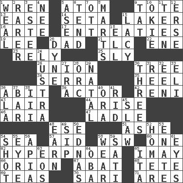 ACROSS 1. Songbird 5. Tiny particle 9. Carry 13. Comfort 14. Stalk of a moss capsule 15. Member of a famous L.A. basketball team 16. Johnson of "Laugh-In" 17. Pleas 19. Area sheltered from the wind 20. June honoree 21. Affectionate concern, for short 22. Compass dir. 23. Depend 25. Playfully artful 26. The state of being joined or united 30. Woody plant 34. Father Junipero _ 35. The bottom of a shoe or boot 36. "This won't hurt ____!" 39. Thespian 42. Painter Guido (1575-1642) 43. Den 44. Originate 46. Operatic vocal solo 47. Dipping utensil 48. Compass dir. 51. American tennis player Robert 54. Ocean 57. Help 58. Compass dir. 60. Single 62. Abnormally rapid or deep breathing 65. "If ____ say so..." 66. Greek mythologigal hunter 67. Blind as ____ 68. Wig 69. Beverages made from leaves 70. Indian skirt 71. Ancient Greek god of war DOWN 1. Welt 2. More valued for its uncommonness 3. First name in cosmetics 4. Born 5. At sea 6. Look after 7. Baseball player Mel 8. Shops 9. Make lace 10. Migrant worker of the '30s 11. Adolescent 12. Celtic language 15. Made of lace 18. Pipe bend 20. Unit of force 24. A period of five years 27. Lyricist Gershwin 28. The grampus (Milton) 29. Relating to or accompanying birth 30. Threesomes 31. To riddle 32. Car or cant ending 33. Connecticut Ivy Leaguer 36. Insect wing 37. Tavern 38. One more than two 40. Mouth or opening 41. To free from 45. Cole _ (cabbage dish) 48. Merit 49. Small drink 50. Ferber et al. 52. Home run 53. Maternal 54. Went for two points 55. Jane of fiction 56. Capital of Western Samoa 58. Erode 59. Suttee (variant) 61. Sight organs 63. Greek goddess of the dawn 64. Chief or king in Benin or Nigeria 65. Call ___ day