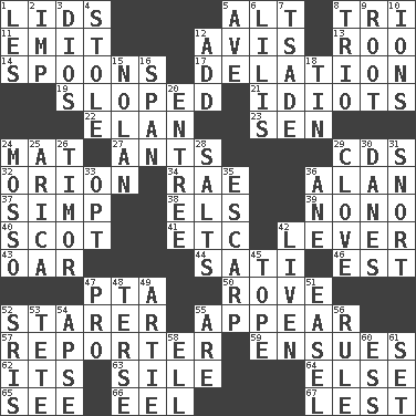 ACROSS 1. Hats (slang) 5. Keyboard modifier key 8. Three (prefix) 11. Send forth 12. Deliberation 13. Friend of Pooh 14. Soup utensils 17. Accusation by an informer 19. Inclined 21. Foolish or stupid persons 22. Flair 23. Elected rep. 24. Floor covering 27. Pismires 29. Music discs 32. Greek mythologigal hunter 34. Actress Charlotte 36. ____ Jay Lerner 37. Simple or foolish person 38. Raised railways 39. Words to Nanette 40. Native of Scotland 41. And so on (abbr.) 42. Prying instrument 43. Boat paddle 44. Suttee (variant) 46. Eastern Standard Time (abbr.) 47. Parent Teacher Association (abbr.) 50. Be footloose 52. A viewer who gazes fixedly 55. Seem 57. News announcer 59. Follows as a consequence or result 62. ___ a Wonderful Life 63. Filth; sediment 64. Otherwise 65. Observe 66. Snakelike fish 67. For fear that DOWN 1. French article 2. Mischievous child 3. "Vaya con ____" 4. Took without asking 5. "___ Maria" 6. Ms. Damita and namesakes 7. Sadhe (variant) 8. Musical group of three 9. Carrot, for example 10. Charged particles 12. Find the sum of 15. Pitcher Ryan 16. Connect, as a bridge 18. Shallow baking pan 20. Main course 24. With motion or animation 25. N. Chile seaport 26. The easternmost of the Lesser Sundas 28. Table seasonings 29. Garlic unit 30. Natives or inhabitants of Denmark 31. Derisive sound 33. Elect 35. Fortification 36. One (Scot) 42. Make or become more lively 45. Drink excessively 47. Adept person 48. Laconic 49. Nick name for Arthur 51. Artist's stand 52. Indian titles of respect 53. False hair 54. Domed church section 55. "We ___ not amused" (Victoria) 56. Governing power 58. Pipe bend 60. Curvy letter 61. Put into a specified state