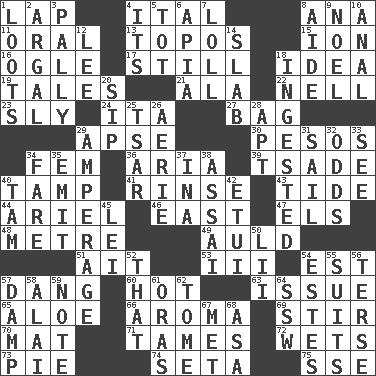 ACROSS 1. Infant locale 4. Slanted text style (abbr.) 8. Santa ___, CA 11. Relating to the mouth 13. Traditional theme or motif 15. Electrically charged atom 16. Stare 17. Free from disturbance or agitation 18. The content of cognition 19. Falsehoods 21. Chicken ___ king 22. 1994 drama film starring Jodie Foster 23. Cunning 24. Call ___ day 27. Paper or plastic container 29. Domed church section 30. Mexican monetary units 34. Opposite of masc. 36. Roberta Peters solo 39. Sadhe (variant) 40. Pack (down) 41. Wash lightly 43. Event that recurs at intervals 44. Satellite of Uranus 46. Compass direction 47. Raised railways 48. Distance measurement (Brit.) 49. Old (Scot.) 51. Small island 53. One more than two 54. Eastern Standard Time (abbr.) 57. Mild oath, euphamism for damn 60. Being at a high temperature 63. Come out of 65. _ vera 66. Scent 69. Move through with a circular motion 70. Floor protector 71. Domesticates 72. Soaks 73. Sliced dessert 74. Stalk of a moss capsule 75. Compass dir. DOWN 1. Plunders 2. Therefore, facetiously 3. Friendly 4. ___ a Wonderful Life 5. Small child 6. Capital of Western Samoa 7. Hang loosely or laxly 8. Assistant 9. Christmas carol 10. Of or related to the anus 12. Area sheltered from the wind 14. Broad, flat, thick piece 18. Consumed 20. Small drink 25. Russian ruler of old 26. Nest on high 28. Fitting 29. Electrical Measurement 31. Move on water 32. Likelihood 33. Perceive with the eye 34. Conductor's collection 35. Send forth 37. _ tizzy (2 wds.) 38. Slender Brazilian palm 40. Scottish cap 42. Needle case 45. Flowery wreath 50. Cards in a Roman deck? 52. Not this but _ 54. _____ Park, CO 55. Sets of matching outer garments 56. Laconic 57. Moist 58. Jai _ 59. Short letter 61. Mouths or openings 62. Heavy book 64. Compass dir. 67. Was introduced to 68. White ___ sheet