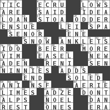 ACROSS 1. Nervous spasm 4. Shade of tan 8. Coldest temperatures 12. "We ___ not amused" (Victoria) 13. Stated 14. The content of cognition 15. Grant temporary use of 17. Portico 18. More peculiar 19. Take place subsequently 21. Flowery wreath 23. Health resort 24. Sir (Sp.) 26. Compass dir. 28. Overwhelm 30. Short socks 34. Wedding promise 37. Fermented drink made from hops 39. Greater amount 40. Zeal 41. Artist's stand 43. ___ Haven, CT 44. Arabian gulf 46. Painter Guido (1575-1642) 47. Elected rep. 48. Simpletons 51. Sums up 54. Conclude 55. Having a sole or soles 58. Cuckoo 61. Science/research agcy. 63. Nest on high 65. Citrus fruits 67. Edge tool used to cut and shape wood 71. Do not 72. High mountains 73. Christmas carol 74. Daniel's nick name 75. Respite 76. Washington bills 77. Epoch DOWN 1. Lie 2. Removes the wrinkles 3. Stop 4. Double-curved letter 5. Domesticated feline 6. River (Sp.) 7. Freehold land 8. Flaplike covering 9. Likelihood 10. Shed a tear 11. "Two Mules for Sister ____" 16. Religious women 18. Pig sound 20. A really long time 22. Car or cant ending 25. Loose flowing garment 27. Shade tree 29. Erodes 30. Sports stadium 31. Immeasurably long periods of time 32. Relationship diagram 33. Stitched 34. _ the terrible 35. "You Light Up My Life" star Conn 36. Sign of something about to happen 38. Compass dir. 42. Hats (slang) 45. Compass dir. 49. Restaurants 50. Begley and Asner 52. ___ good deed 53. Downhill vehicle 56. Wear away 57. Middle Eastern gold or silver currency 58. Having or resembling wings 59. "Death on the ____" 60. Naughty children 62. Papal veil 64. Inactive volcano in Sicily 66. Eastern Standard Time (abbr.) 68. Spanish title 69. Last letter of the English alphabet 70. Raised railways