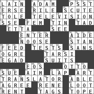 ACROSS 1. (Had) reclined 5. First man 9. Inconspicuous attention getter 13. Celtic language 14. Cause heat under the collar 15. Snake scale 16. Lacquered or enameled metalware 17. Boob tube 19. Compass dir. 20. Opposite of masc. 21. Shallow baking pan 22. Small amount or degree 23. Singer James 25. Perceive with the eye 26. Keyboard key 30. Assistant 34. Trap for birds or small mammals 35. Comedian Laurel of Laurel & Hardy 36. Nourish 39. Trials 42. Without 43. Legendary monster 44. Tarsus (plural) 46. Mild oath 47. Costumes for special activities 48. Greek goddess of the dawn 51. Von Bismarck 54. Take to court 57. Direct toward a target or goal 58. Pet locale 60. Nonscientific branch of learning 62. Interpreter 65. Competent 66. Match 67. French philosopher Descartes 68. Spoils 69. Monthly bill 70. Labels 71. Drink excessively DOWN 1. Allows 2. Came up 3. Small island 4. Born 5. Johnson of "Laugh-In" 6. South Vietnam president (1954) 7. 100% 8. Confronts 9. Personal Computers (abbr.) 10. Set of matching outer garments 11. Portico 12. Watch over 15. Trig term 18. Compete 20. Papal veil 24. Watched over 27. Small child 28. Compass dir. 29. Musical pauses 30. Aid 31. Call ___ day 32. One of the 12 tribes of Israel 33. Followers of ems 36. Enemy 37. Ovum 38. Epoch 40. The 19th letter of the Greek alphabet 41. _ Lanka 45. Halt 48. Relaxation 49. Lubricate 50. Don Adams' spy role 52. Off limits 53. Lowest deck of a ship 54. Play the lead 55. Goad 56. Merit 58. Having great length 59. Ancient Greek god of war 61. False hair 63. Remaining after all deductions 64. Afternoon social gathering 65. The first octave above the treble staff
