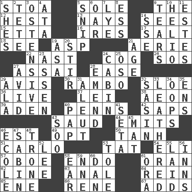 ACROSS 1. Portico 5. Flatfish 9. Definite Article 12. Command 13. Negative votes 14. Observes 15. Singer James 16. Angers 17. Table seasoning 18. Observe 19. Viper 21. Nest on high 22. Political cartoonist Thomas 24. Gear tooth 26. Mayday 27. Slender Brazilian palm 28. Comfort 29. Opinion 30. Role for Stallone 32. _ gin 36. Not recorded 37. Flowery wreath 38. Period of immesurable duration 39. Arabian gulf 40. Actor Sean's family 42. Plant excrements 43. Saudi Arabian king (1953-1964) 44. Gives off 46. Eastern Standard Time (abbr.) 49. Choose 50. Hyperbolic tangent 51. Monte _, Las Vegas Hotel/Casino 53. Make lace 54. Biblical high priest 57. Mitch Miller's instrument 58. Inside; within (prefix) 61. Northwest Algerian city 62. Actor's bit 63. Of or related to the anus 64. It's straight from the horse's mouth 65. Compass dir. 66. French philosopher Descartes 67. Does sums DOWN 1. "______ My Girl" (Turtles hit) 2. False hair 3. Clearly or manifestly demonstrative 4. _ moment's notice (2 wds.) 5. Sever or remove by pinching or nipping 6. Boat paddle 7. Sodium hydroxide 8. Double-curved letter 9. Pulls into pieces 10. Sun: prefix 11. _____ Park, CO 14. Compass dir. 19. White ___ sheet 20. Disorderly outburst 21. Ripen 23. NE Netherlands city 24. Small house or cottage 25. Bear (Spanish) 27. Enthusiastic 28. Make improvements or corrections to 29. Chicken ___ king 31. Native American of Southwest Alaska 32. Indian antelope 33. Resembling or made to resemble leather 34. I made a mistake 35. Followers of ems 40. Infant food 41. Bristle 43. "Barney Miller" actor Jack 45. Floor covering 46. Learning spot: Fr. 47. Unit of acoustic absorption 48. Marketplace scale 52. Area sheltered from the wind 53. Lacquered or enameled metalware 55. Put down 56. Lodging establishments 58. Hearing organ 59. Compass dir. 60. One of the 12 tribes of Israel 61. Mouth or opening