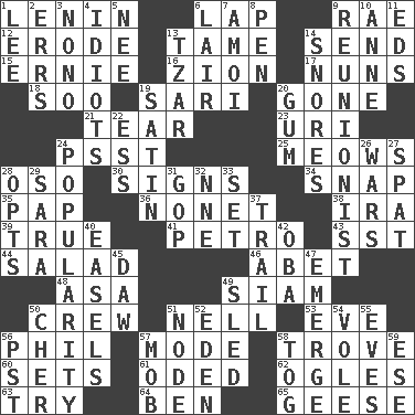 ACROSS 1. Soviet premier 1918-24 6. Pet locale 9. Actress Charlotte 12. Eat (away) 13. Not wild 14. Post 15. Bert's buddy 16. The Jewish people; Israel 17. Religious women 18. "Barney Miller" actor Jack 19. Indian skirt 20. Went 21. Lacerate 23. RI univ. 24. Inconspicuous attention getter 25. Catcalls? 28. Bear (Spanish) 30. Signals 34. Fastener 35. Infant food 36. Music written for nine 38. Retirement account (abbr.) 39. Loyal 41. Stone: prefix 43. Fast jet (abbr.) 44. First course 46. Collude with 48. White ___ sheet 49. Thailand, formerly 50. Ship's personnel 51. 1994 drama film starring Jodie Foster 53. Night before a holiday 56. Silvers or Donahue 57. Method 58. Collection of objects 60. Arranges properly for use 61. Wrote a lyric poem 62. Stares at amorously 63. Attempt 64. Benjamin's nick name 65. Honkers DOWN 1. Area sheltered from the wind 2. Blunders 3. Words to Nanette 4. Foolish or stupid persons 5. Born 6. Den 7. Mine, in Marseilles 8. Fenced enclosure 9. One who advocates reunion 10. Queen of England 1702-14 11. Begley and Asner 13. Czar 14. Sounds asleep 19. Smooth fabric 20. Chewing product 22. Curvy letter 24. Teen's desire 26. Armed conflicts 27. Petty quarrel 28. Elects 29. "Two Mules for Sister ____" 31. Grand Old Party 32. Compass dir. 33. Put into a specified state 37. Get behind 40. Artist's stands 42. Chief or king in Benin or Nigeria 45. Simpleton 47. Develop 49. Downhill vehicle 50. "Mermaids" star 51. Connecting point 52. Locale of original sin 54. Short-tailed, large-bodied rat 55. Nights before holidays 56. Pacific Standard Time (abbr.) 57. Crowd into 58. Coat; cloak 59. Compass dir.