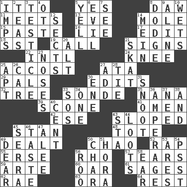 ACROSS 1. "Tell ____ the Marines!" 5. It is so 8. Obsolete 11. Confronts 13. First lady 14. Undercover agent 15. Thick mixture 16. Untruth 17. Prepare for publication 18. Fast jet (abbr.) 19. Give a ring to 21. Public displays of written messages 22. International (abbr.) 24. Leg joint 25. Buttonhole 27. "One Day ___ Time" 29. Friends 30. Prepares for publication 32. Woody plant 33. Message 35. Nanny 39. Biscuitlike quick bread 41. Presage 42. Compass dir. 43. Slanted 45. Comedian Laurel of Laurel & Hardy 48. Lug 49. Started a card game 50. US Secretary of Labor Elaine L. _ 52. Hit sharply and swiftly 55. Celtic language 56. 17th letter of the Greek alphabet 57. Pulls apart 59. Johnson of "Laugh-In" 60. Boat paddle 61. Gurus 62. Actress Charlotte 63. Mouth or opening 64. Remainder DOWN 1. Naughty children 2. Afternoon social gatherings 3. A testis 4. Baseball player Mel 5. Shout 6. Morally bad or wrong 7. Observe 8. Evade 9. Place in a line 10. Moistens 12. Religious groups 14. Count _ (2 wds.) 20. The first octave above the treble staff 21. Three-handed card game 23. Olfactory organs 25. Fitting 26. Auto 27. Increase 28. Neckwear 30. Compass dir. 31. Snob 33. Mayday 34. Single 36. Electrical Measurement 37. Born 38. Added to 40. Penny 43. R.R. building 44. Plunders 45. Spanish missionary in California 46. Clothes sense 47. Toward shelter 49. Letter starter 50. Burn to charcoal 51. Israeli folk dance 53. Ancient Greek god of war 54. Inconspicuous attention getter 56. Friend of Pooh 58. Hearing organ