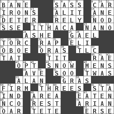 ACROSS 1. Object of repulsion 5. Backtalk 9. Automobile 12. Metal shackles 14. Came down and settled, as after flight 15. One (Scot) 16. Prevent from occurring 17. Have trust in 18. Dreamland 19. Compass dir. 20. New York city 23. Billionth: prefix 24. American tennis player Robert 25. Highlander 27. Torque (variant) 30. Reproach for some lapse or misdeed 32. Connecticut Ivy Leaguer 33. Mitch Miller's instrument 34. Mouths or openings 36. Affectionate concern, for short 38. Make lace 39. Teat (slang) 40. Actress Charlotte 43. Choose 46. Frozen precipitation 48. Not women's 49. "___ Maria" 51. "Barney Miller" actor Jack 52. It was, poetically 53. ____ Jay Lerner 54. Pate de foie ____ 56. Unshakable 58. Trios 61. R.R. building 64. Indiana (abbr.) 65. Length times width 66. Consumed 68. Non-commissioned officer (abbr.) 69. Repose 70. Believer in; advocate of (suffix) 71. Rowing implement 72. False hair 73. Celtic language DOWN 1. Auction offers 2. Ancient Greek god of war 3. Observe 4. Compass dir. 5. "Two Mules for Sister ____" 6. Actor Baldwin 7. Fodder prepared in a silo 8. Filthy place 9. Lessep's creation 10. Soon (poet.) 11. Make new 13. Indian titles of respect 21. Through, poetically 22. Centers 23. Famous astronaut Armstrong 24. Adept person 26. Keyboard modifier key 27. Small child 28. Chief or king in Benin or Nigeria 29. Printing process, for short 31. Aches 35. Moe Howard, for one 37. Ship's personnel 41. Santa ___, CA 42. Double-curved letter 44. Inside of hand 45. Federal power corp. 47. Had on 48. Mountains (abbr.) 50. Main course 53. Zeal 55. Toward the sea 56. Fine (Spanish) 57. South American Indian 59. Command 60. Pace 61. Commotion 62. Afternoon social gatherings 63. Queen of England 1702-14 65. Tate display 67. "We ___ not amused" (Victoria)