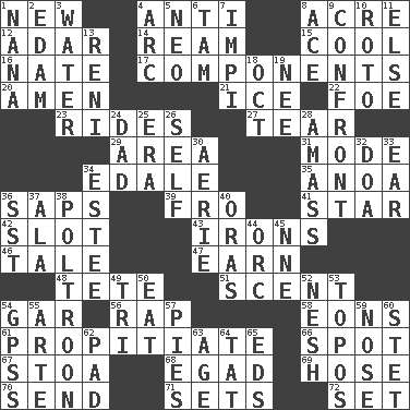 ACROSS 1. ___ Haven, CT 4. Opposed to 8. Land measure 12. The sixth month of the Jewish calendar 14. 480, 500 or 516 sheets of paper 15. Calm and collected 16. Nathan's nickname 17. Parts 20. So be it 21. Frozen water 22. Enemy 23. Amusement-park features 27. Rend 29. Length times width 31. Method 34. Peak District village in England 35. Small Philippine buffalo 36. Plant excrements 39. From 41. Play the lead 42. Slit 43. Metal shackles 46. Story 47. Merit 48. Wig 51. Aroma 54. Slender fish 56. Reproach for some lapse or misdeed 58. Immeasurably long periods of time 61. Conciliate 66. Specific locale 67. Portico 68. Mild oath 69. Flexible conduit 70. Post 71. Puts into a specified state 72. Arrange properly for use DOWN 1. Grandmother 2. Dutch treat 3. Wetness 4. Curve 5. Modern: prefix 6. Scottish cap 7. Body of Kaffir warriors 8. Adept person 9. Meet 10. Printing process, for short 11. Otherwise 13. Painter Guido (1575-1642) 18. Sep. follower 19. Born 24. Male parent 25. Epoch 26. Automatically 28. Collect or gather 30. Nest on high 32. ___ good deed 33. Ewer handle 34. First name in cosmetics 36. Fast jet (abbr.) 37. Wing 38. Characterized by complete cowardliness 40. Mouths or openings 44. The grampus (Milton) 45. Compass dir. 49. Three (prefix) 50. Ingest 52. Tender 53. Traditional theme or motif 54. Global Positioning Systems (abbr.) 55. Johnson of "Laugh-In" 57. Sliced desserts 59. Olfactory organ 60. Proofreading order 62. Writing tablet 63. Ripen 64. Make lace 65. Begley and Asner