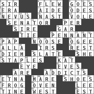 ACROSS 1. Title for a knight 4. Soared 8. Moves 12. Epoch 13. Helper 14. Lyric poems 15. Congenital growth or mark on the skin 18. Political cartoonist Thomas 19. Grand slam 20. Elected representative 22. For each 23. Title for a man of rank and authority 24. Slender fish 25. Standoff 26. Pre-World Series prize 30. Infant food 33. Trap for birds or small mammals 36. Double curve, resembling the letter S 37. Silent film actress Nazimova 39. Big collection agency 40. Relief 41. South Vietnam president (1954) 42. Schedule 44. A female animal or person 45. Paper fasteners 47. Krazy ___ of comics 50. Sight organ 51. Nights before holidays 53. "We ___ not amused" (Victoria) 54. Inveterate users 57. Inactive volcano in Sicily 59. Female horse 61. Imelda's hoard 63. Tree-dwelling hopper 64. Baking chamber 65. Area sheltered from the wind 66. Prong on a fork 67. Compass direction 68. Eastern Standard Time (abbr.) DOWN 1. Elected rep. 2. Angers 3. All-night dance parties 4. Papal veil 5. One who doesn't tell the truth 6. Begley and Asner 7. Soggy 8. Head of state? 9. Aroma 10. Snakelike fish 11. Compass dir. 16. A single undivided whole 17. Indian skirt 21. Adolescent 22. Baking dish 24. Turn to the right 26. Inconspicuous attention getter 27. Ripens 28. Tender 29. Wig 30. Groovy apts. 31. Set down 32. Entreaty 34. Petroleums 35. Mouth or opening 38. Electrical Measurement 42. Observe 43. Supplemented with great effort 46. Sodium hydroxide 48. Advice 49. Technician 52. Fur scarf 53. Soon (poet.) 54. Ancient Greek god of war 55. Gouge 56. Perceives with the eye 57. Newt 58. Three (prefix) 59. Cut the grass 60. "___ Maria" 62. Put into a specified state