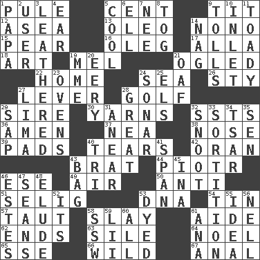 ACROSS 1. Whimper 5. Penny 9. Teat (slang) 12. Toward the sea 13. Margarine 14. Words to Nanette 15. Lightbulb-shaped fruit 16. Cassini of fashion 17. Silent film actress Nazimova 18. Nonscientific branch of learning 19. Cartoonist voice _ Blanc 21. Stared 22. Dwelling 24. Ocean 26. Filthy place 27. Crowbar 28. _ course 29. Male parent of an animal 30. Entertaining tales 32. Fast planes 36. So be it 37. Teachers' org. 38. Olfactory organ 39. Writing tablets 40. Pulls into pieces 42. NW Algerian seaport 43. Naughty child 44. Peter (Polish) 46. Compass dir. 49. Wind 50. Against 51. Former Milwaukee Brewers owner Bud 53. Heredity factor (abbr.) 54. Metal container 57. Strained 58. Kill 61. Assistant 62. Extremities 63. Drop; flow; fall 64. Christmas carol 65. Compass dir. 66. Uncontrolled 67. Of or related to the anus DOWN 1. Dad 2. One who uses or employs something 3. Resembling or made to resemble leather 4. Ewer handle 5. Calm and collected 6. Pipe bend 7. Born 8. Coat; cloak 9. For Whom the Bell _____ 10. An arm off of a larger body of water 11. Sycophant 14. Tired old horse 19. Madame (abbr.) 20. Suggestive of the supernatural 21. Clumsy lout 23. Baking chambers 24. Underwater navigation system 25. Raised railways 27. Pale green bean 28. Relatively large 29. Plant excrement 31. Approach 32. Snout, nose 33. Decision 34. Russian ruler of old 35. Elected rep. 40. Three (prefix) 41. Connect, as a bridge 43. Paper or plastic container 45. _ tizzy (2 wds.) 46. _____ Park, CO 47. Actors Connery and Penn 48. Evade 52. It is 53. Colored 55. The content of cognition 56. 1994 drama film starring Jodie Foster 58. Compass dir. 59. Cards in a Roman deck? 60. 100% 61. Santa ___, CA