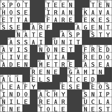 ACROSS 1. Specific locale 5. Adolescent 9. "___ Little Indians" 12. Stockings 13. SW Asia republic 14. Polynesian shrub of the pepper family 15. Singer James 16. Conductor's collection 17. Makes supply last 18. Compass dir. 19. Sandy's bark 21. Rep 22. Nathan's nickname 24. Viper 26. Filthy place 27. Slender Brazilian palm 28. A single undivided whole 29. Deliberation 30. Music written for nine 32. Flintstone 36. Moving, as bait 37. By way of 38. Do over again 39. An important port of Yemen 40. Distance measurement (Brit.) 42. At sea 43. French philosopher Descartes 44. Homeless child 46. Everything 49. Raised railways 50. On the rocks 51. Like summer trees 53. Compass dir. 54. Greek goddess of the dawn 57. _ china 58. Painful 61. Clip 62. "Death on the ____" 63. Stern 64. Southern CA. univ. 65. Compass dir. 66. Lacquered or enameled metalware 67. A home for chicks DOWN 1. "______ My Girl" (Turtles hit) 2. Plant holders 3. Clearly or manifestly demonstrative 4. Beverage made from leaves 5. Small quarrel 6. Period 7. Ewer handle 8. Compass dir. 9. Proceeds 10. Incident 11. Offensive 14. Cask 19. _ moment's notice (2 wds.) 20. It's straight from the horse's mouth 21. Fitting 23. NE Netherlands city 24. Approach 25. Be seated 27. Enthusiastic 28. Join together 29. Insect wing 31. Baking chambers 32. Movie unit 33. Home 34. Genesis locale 35. ___ good deed 40. Cartoonist voice _ Blanc 41. The front part of a cuirass 43. Marina Del _, California 45. Adept person 46. Place in a line 47. Soviet premier 1918-24 48. Dipping utensil 52. Enemy 53. Jane of fiction 55. Lubricates 56. Argument over a trivial matter 58. Tate display 59. Corporate head (abbr.) 60. Actor Linden 61. Player for Phoenix