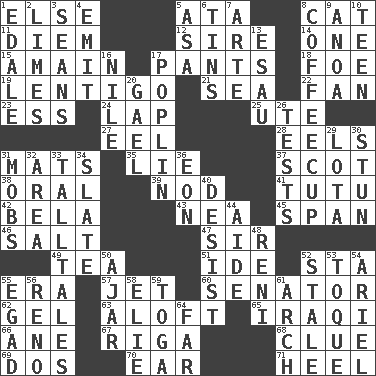ACROSS 1. Otherwise 5. "One Day ___ Time" 8. Feline 11. South Vietnam president (1954) 12. Father 14. Single 15. With great haste 17. Leg coverings 18. Enemy 19. Small, flat, pigmented spot on the skin 21. Ocean 22. Avid follower 23. Curvy letter 24. Infant locale 25. Shoshoni 27. Snakelike fish 28. Snakelike fish 31. Floor protectors 35. Falsehood 37. Highlander 38. Of the mouth 39. Dreamland 41. Ballerina skirt 42. Actor Lugosi 43. Teachers' org. 45. Connect, as a bridge 46. Table seasoning 47. Title for a knight 49. Beverage made from leaves 51. Binary compound 52. R.R. building 55. Epoch 57. Type of plane 60. Elected representative 62. Set 63. High up in or into the air 65. Resident of Iraq 66. One (Scot) 67. Port city in Latvia 68. A slight indication 69. Two (Sp.) 70. Ewer handle 71. Person who is morally reprehensible DOWN 1. Peak District village in England 2. Citrus fruits 3. Seines 4. Give off 5. White ___ sheet 6. Canisters 7. Johnson of "Laugh-In" 8. Java holder (2 wds.) 9. Small Philippine buffalo 10. Adolescent 13. Son of Isaac 16. "Death on the ____" 17. Cotton for raincoats, e.g. 20. Highlander 26. Trials 29. Globular water bottle used in Asia 30. Make senseless or dizzy 31. Crowds into 32. Length times width 33. Baron Munchausen's specialties 34. Chalkboard 36. Period of immesurable duration 40. Cease 44. Helper 48. Painter Guido (1575-1642) 50. Partly open 52. Lacking originality or spontaneity 53. Woman's close-fitting hat 54. Satellite of Uranus 55. Mild oath 56. Western Nevada city 58. Writer Wiesel 59. Ancient Roman robe 61. Bowlike part 64. Distant