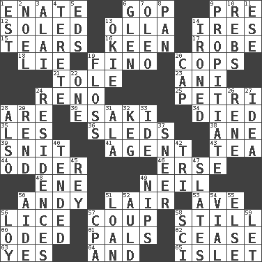 ACROSS 1. Maternal 6. Grand Old Party 9. Before (prefix) 12. Having a sole or soles 13. Water jar 14. Angers 15. Pulls apart 16. Peachy ____! 17. Loose flowing garment 18. Whopper 19. A pale, very dry sherry 20. 911 reaches them 21. Lacquered or enameled metalware 23. Cuckoo 24. Former U.S. Attorney General Janet 25. _ dish (used to culture cells) 28. "We ___ not amused" (Victoria) 30. 1973 Nobel Price Winner (Physics) Leo 34. Passed on 35. French article 36. Bobsleighs 38. One (Scot) 39. In a ____ (agitated or irritated) 41. Rep 43. Afternoon social gathering 44. More peculiar 46. Celtic language 48. Compass dir. 49. Famous astronaut Armstrong 50. "60 Minutes" Commentator Rooney 51. Den 53. "___ Maria" 56. Louse (plural) 57. Overturn; upset 58. Free of sound 60. Wrote a lyric poem 61. Friends 62. Stop 63. Affirmative reply 64. Also 65. Small island DOWN 1. Eastern Standard Time (abbr.) 2. Christmas carol 3. Jai ____ 4. Cigar-shaped 5. Begley and Asner 6. Small, secluded valley 7. Butter sub 8. Baking dish 9. Appease 10. Confederate soldiers (slang) 11. Compass dir. 13. Migrant worker of the '30s 14. Pressed 19. Soft thread for cleaning between teeth 20. Head covering 22. Single 24. Homes 26. French philosopher Descartes 27. The content of cognition 28. In addition 29. Tear apart 31. Chicken ___ king 32. Cask 33. Binary compound 37. Scornful expression 40. Looked after 42. Three (prefix) 45. Marina Del _, California 47. Chalkboards 49. Cuts off 50. Assistant 51. Grant temporary use of 52. Old (Scot.) 54. Small bottle 55. Otherwise 56. Myrna of the movies 57. Accounting whiz (abbr.) 58. _-fi 59. Allow
