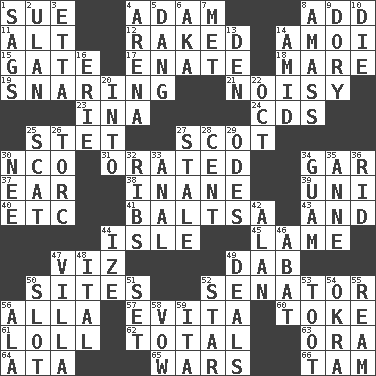 ACROSS 1. Institute legal proceedings 4. First man 8. Increase 11. The first octave above the treble staff 12. Moved through 14. Mine, in Marseilles 15. Yard entry 17. Maternal 18. Female horse 19. Catching in a trap 21. Annoyingly loud 23. _ tizzy (2 wds.) 24. Music discs 25. Proofreading order 27. Native of Scotland 30. Non-commissioned officer (abbr.) 31. Spoke pompously 34. Slender fish 37. Hearing organ 38. Silly 39. Single; one (prefix) 40. And so on (abbr.) 41. Greek mezzo-soprano Agnes 43. Plus 44. Small island 45. Unable to walk 47. Namely 49. Pat or tap gently 50. Locates 52. Elected representative 56. Silent film actress Nazimova 57. Webber/Rice musical 60. Puff or smoke 61. Hang loosely or laxly 62. Add up to 63. Mouth or opening 64. _ moment's notice (2 wds.) 65. Armed conflicts 66. Scottish cap DOWN 1. Droops 2. ____ Bator 3. Singer James 4. Sports stadium 5. Mild oath, euphamism for damn 6. Alias (abbr.) 7. Was introduced to 8. Collect or gather 9. Rowboat 10. Pass on 13. Lair 14. Among 16. One of the Great Lakes 20. To the inside or interior of 22. Sep. follower 25. Scram, to a cat 26. Torque (variant) 27. Having lost freshness 28. Penny 29. Lyric poems 30. Born 32. Teases 33. Of or related to the anus 34. Island territory of the United States 35. Queen of England 1702-14 36. To free from 42. ____ Jay Lerner 44. Ending with capital 46. Blind as ____ 47. Country residence 48. Slanted text style (abbr.) 49. Allots cards 50. Narrow, elongated depression 51. Arrange properly for use 52. Play the lead 53. A blast of a horn 54. Gumbo ingredient 55. 480, 500 or 516 sheets of paper 56. Wing 58. Promise 59. Call ___ day