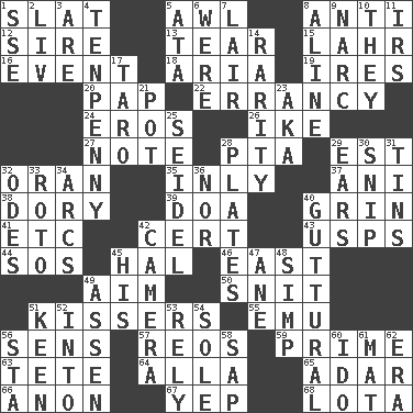 ACROSS 1. Narrow board 5. Leather borer 8. Against 12. Father 13. Separate forcefully 15. Cowardly lion portrayer 16. Incident 18. Operatic vocal solo 19. Angers 20. Infant food 22. The state or an instance of erring 24. Greek god of love 26. Eisenhower's nickname 27. Make mention of 28. Parent Teacher Assoc. 29. Eastern Standard Time (abbr.) 32. NW Algerian seaport 35. In an inward manner 37. Cuckoo 38. Dinghy 39. ___ good deed 40. Amused look 41. And so on (abbr.) 42. Certainty 43. United States Postal Service (abbr.) 44. Distress signal 45. Actor Linden 46. 90 degrees 49. Direct toward a target or goal 50. In a ____ (agitated or irritated) 51. Smoochers 55. Australian flightless bird 56. Elected reps. 57. Vintage cars 59. A-one 63. False hair 64. Silent film actress Nazimova 65. The sixth month of the Jewish calendar 66. Soon (poet.) 67. Slangy assent 68. Globular water bottle used in Asia DOWN 1. Compass dir. 2. 54 in ancient Rome 3. "We ___ not amused" (Victoria) 4. 3-inch nail 5. _ moment's notice (2 wds.) 6. We are 7. Den 8. Place in a line 9. Drug cop 10. Those things 11. Big collection agency 14. Noteworthy scarcity 17. Pacific island yam 21. Plant holder 23. Alias (abbr.) 25. A glass for beer 28. Food holders 29. Hearing organs 30. Clip 31. Airtight sealed metal containers 32. Lyric poems 33. Printing process, for short 34. Curves 36. Not either 40. From the throat 42. Device for capturing images 45. Part of HMS, perhaps 47. One (Scot) 48. Simple or foolish person 49. NE Netherlands city 51. Peachy ____! 52. To the inside or interior of 53. Trust 54. Not divided or shared with others 56. R.R. building 58. Plant excrement 60. Wedding promise 61. Floor covering 62. Epoch