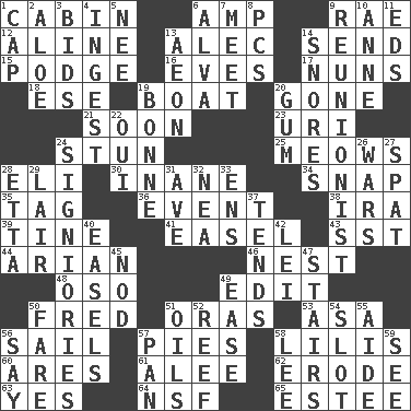 ACROSS 1. Apartment or room in a ship 6. Electrical Unit 9. Actress Charlotte 12. Place in a line 13. Actor Baldwin 14. Post 15. Porridge 16. Nights before holidays 17. Religious women 18. Compass dir. 19. Water vessel 20. Went 21. Within a short period 23. RI univ. 24. Make senseless or dizzy 25. Catcalls? 28. Connecticut Ivy Leaguer 30. Lacking in sense or substance 34. Fastener 35. Label 36. Incident 38. Lyricist Gershwin 39. Prong on a fork 41. Artist's stand 43. Fast jet (abbr.) 44. Believer in; advocate of (suffix) 46. A home for chicks 48. Bear (Spanish) 49. Prepare for publication 50. Flintstone 51. Mouths or openings 53. White ___ sheet 56. Move on water 57. Sliced desserts 58. Ms. Damita and namesakes 60. Ancient Greek god of war 61. Toward shelter 62. Eat (away) 63. It is so 64. Science/research agcy. 65. First name in cosmetics DOWN 1. Head covering 2. Medicinal plant 3. Auction offers 4. Swallow 5. Born 6. Inventor's middle name 7. Rendezvous 8. Personal Computers (abbr.) 9. One who advocates reunion 10. Queen of England 1702-14 11. Begley and Asner 13. A really long time 14. Sounds asleep 19. Maid-servant 20. Chewing product 22. Fr. "Yes" 24. Seigniories (variant) 26. Armed conflicts 27. Argument over a trivial matter 28. Singer James 29. Den 31. "___ Maria" 32. Teachers' org. 33. Followers of ems 37. Watches over 40. Artist's stands 42. Flowery wreath 45. Dreamland 47. Flight of steps 49. Comfort 50. Conductor's collection 51. Petroleums 52. Coral collection 54. Notch 55. Helper 56. Declare 57. Baking dish 58. Area sheltered from the wind 59. Observe