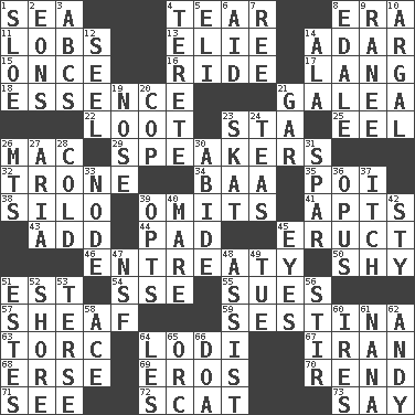 ACROSS 1. Ocean 4. Separate forcefully 8. Epoch 11. Tennis shots 13. Writer Wiesel 14. The sixth month of the Jewish calendar 15. Single time 16. Travel on or in a vehicle 17. Austrian-born American filmmaker Fritz 18. Gist 21. An organ shaped like a helmet 22. Plunder 23. R.R. building 25. Snakelike fish 26. Apple computer (short form) 29. Orators 32. Marketplace scale 34. Sound made by sheep 35. Luau course 38. Grain storage tower 39. Leaves out 41. Tenement units (abbr.) 43. Say or write further 44. Writing tablet 45. Spew [out] 46. Plea 50. Like a shrinking violet 51. Eastern Standard Time (abbr.) 54. Compass dir. 55. Takes to court 57. To gather and bind into a bundle 59. French poetic form 63. Torque (variant) 64. Farming town in central California 67. SW Asia republic 68. Celtic language 69. Greek god of love 70. Tear apart 71. Observe 72. Scram! 73. Declare DOWN 1. A type of plum 2. Immeasurably long periods of time 3. Lettered men learn these first 4. Cylindrical with tapered ends 5. Connecticut Ivy Leaguer 6. Help 7. To sift 8. Peak District village in England 9. Indian princess (variant) 10. Therefore, facetiously 12. Sew up the eyelids of hawks and falcons 14. Insect wing 19. Olfactory organ 20. Police officer (slang) 21. Slender fish 23. Three-handed card game 24. Afternoon social gatherings 26. Mountains (abbr.) 27. Operatic vocal solo 28. Lacking warmth 30. Stay 31. Coast Guard woman 33. Thickened enlargement 36. Musical composition 37. Hankering 39. Elects 40. Female horse 42. Filthy place 45. Snake ____ (dice throw) 47. Overdraft (abbr.) 48. Aid 49. Third day of the wk. 51. _____ Park, CO 52. Dinah or Pauly 53. Laconic 56. Use a spoon 58. Adept person 60. Angers 61. Grandmother 62. "60 Minutes" Commentator Rooney 64. French article 65. The grampus (Milton) 66. ___ good deed