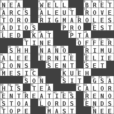 ACROSS 1. Teachers' org. 4. Not ill 8. Cy Young winner Saberhagen 12. Arches 14. Native American of Southwest Alaska 16. Be footloose 17. "Corrida" creature 18. Frustrating wastes of time 20. Goodbye (Sp.) 22. Adept person 23. Eastern Standard Time (abbr.) 24. Directed 25. Krazy ___ of comics 28. Parent Teacher Association (abbr.) 30. Prong on a fork 31. Auction bid 35. Quiet! 37. Billionth: prefix 40. Tall New Zealand timber tree 41. Toward shelter 42. Bert's buddy 44. Writer Wiesel 45. Charged particles 46. Emitted 47. Put into a specified state 48. Mesonic 50. Malaysian steamed pastry 52. Manchild 54. Be seated 55. Girls' org. (abbr.) 58. Part of HMS, perhaps 61. Beverage made from leaves 63. Bodily heat indicating an inflammation 65. Pleas 70. Former U.S. Attorney General Janet 71. Portico 72. Domineers 73. Extremities 74. Drink excessively 75. Vertical spar for supporting sails 76. Born DOWN 1. Brizilian seaport 2. Wear away 3. Sour-tasting 4. Armed conflict 5. Connecticut Ivy Leaguer 6. Part of a journey 7. Mass 8. Sis' sibling 9. Hero or heavy, e.g. 10. Nights before holidays 11. Trial 13. "Barney Miller" actor Jack 15. Canvas cover 19. Printing process, for short 21. What Jean-Claude Killy likes to do 26. Singer Murray 27. Lacerates 29. Anew 30. College paper 32. Do some clerical work 33. Send forth 34. Regret 35. A type of plum 36. Coop moms 38. Compass dir. 39. Pig sounds 41. Direct toward a target or goal 43. Needle case 49. ____ d'Azur (French Riviera) 51. And so on (abbr.) 53. Anneal 55. American astronaut and politician John 56. Something which is sent 57. Came up 58. Behest 59. To the inside or interior of 60. Discontinue 62. Smallest unit of an element 64. "We ___ not amused" (Victoria) 66. Actress Charlotte 67. Retirement account (abbr.) 68. Begley and Asner 69. Fast jet (abbr.)